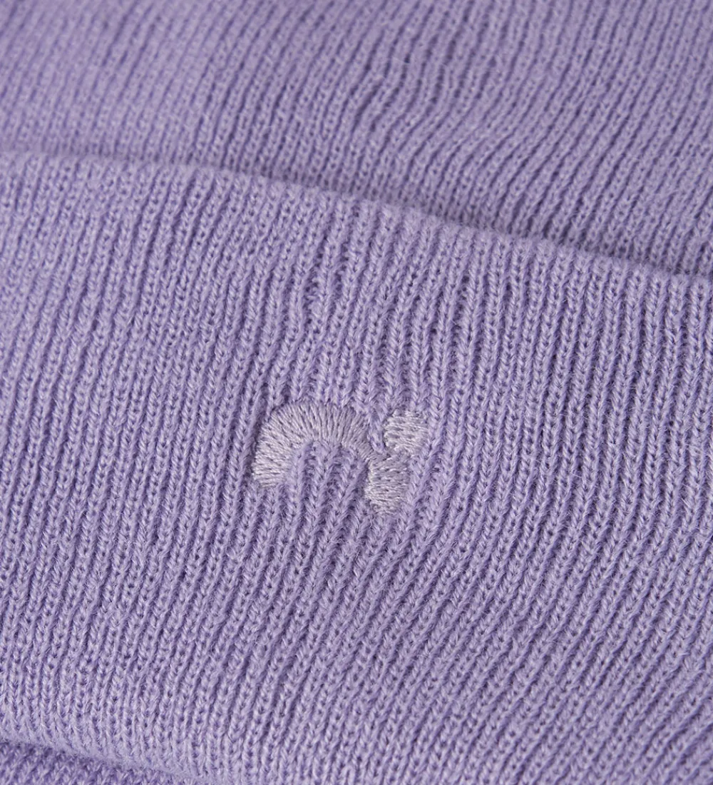 Fin Name It hue i lilla strik med et diskret, broderet logo på fronten. Huen består af to lag med vindblokering ved ørerne, som beskytter ørerne mod kold vind. Huen har en rund hovedform med et bredt ombuk nederst.