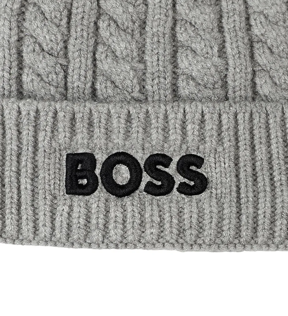 Skøn BOSS hue i meleret grå i en strikket kvalitet og med ribstruktur. Huen har en pompon på toppen, der tilføjer et stilfuldt præg. Fortil står der “Boss” broderet i sort. Huen har en spids form, og den består af et enkelt lag med et ombuk langs kanten.