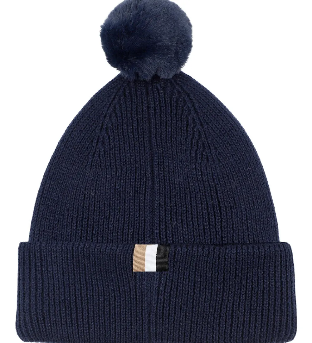 Elegant BOSS hue i en klassisk navy farve i en strikket kvalitet og med ribstruktur. Huen har en flot pompon på toppen, der tilføjer et stilfuldt præg. Fronten prydes af et hvidt BOSS logobrodering. Huen har en spids form, og den består af to lag med et ombuk langs kanten.