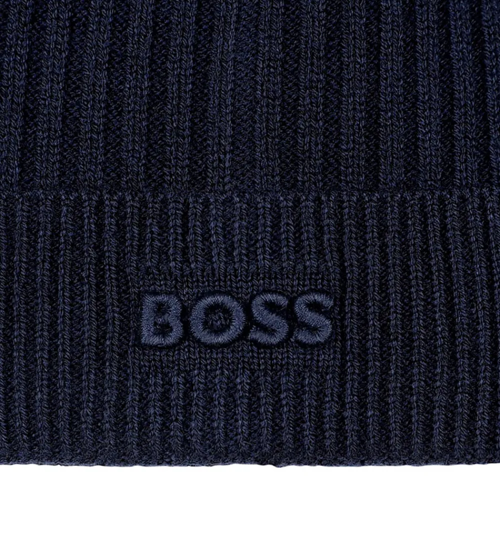 Fin BOSS hue i ensfarvet navy i en let strikket kvalitet med ribstruktur. Huen prydes af et diskret BOSS logo broderet på fronten. Huen har en rund hovedform og et bredt ombuk langs kanten.