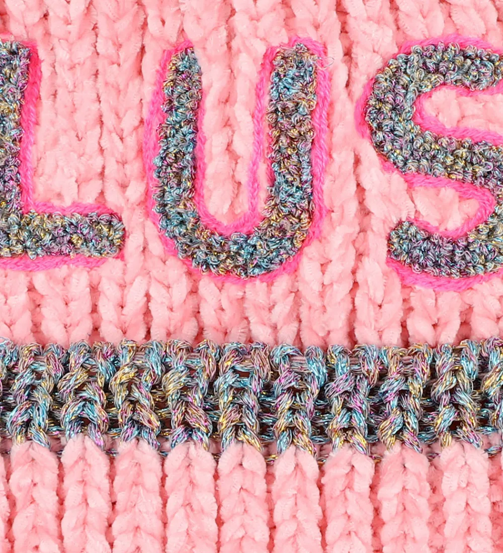 Charmerende Billieblush hue i en klar pink nuance. Huen har en blød pompom på toppen og et iøjnefaldende logo hele vejen rundt, med glitrende bogstaver. En bred strik med en fin, skinnende effekt giver ekstra detaljer til huens nederste kant. Billieblush kombinerer stil og funktion i dette unikke design.