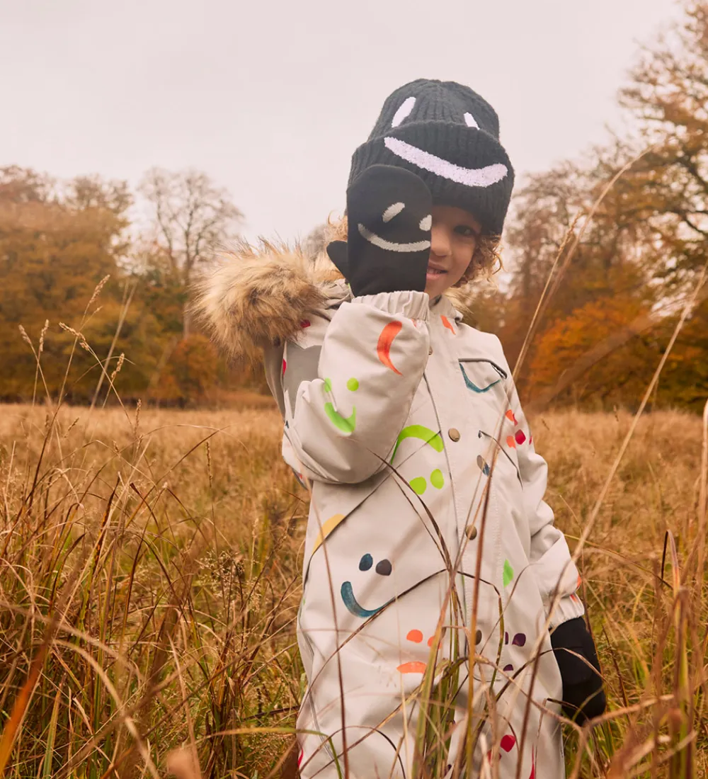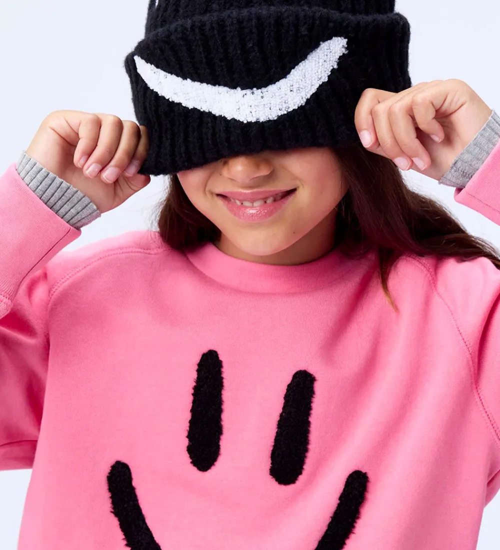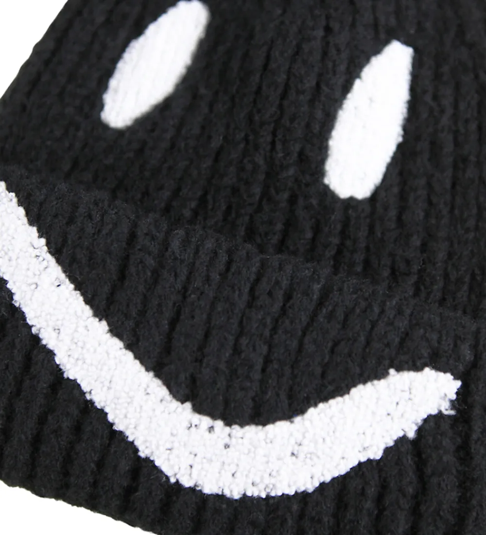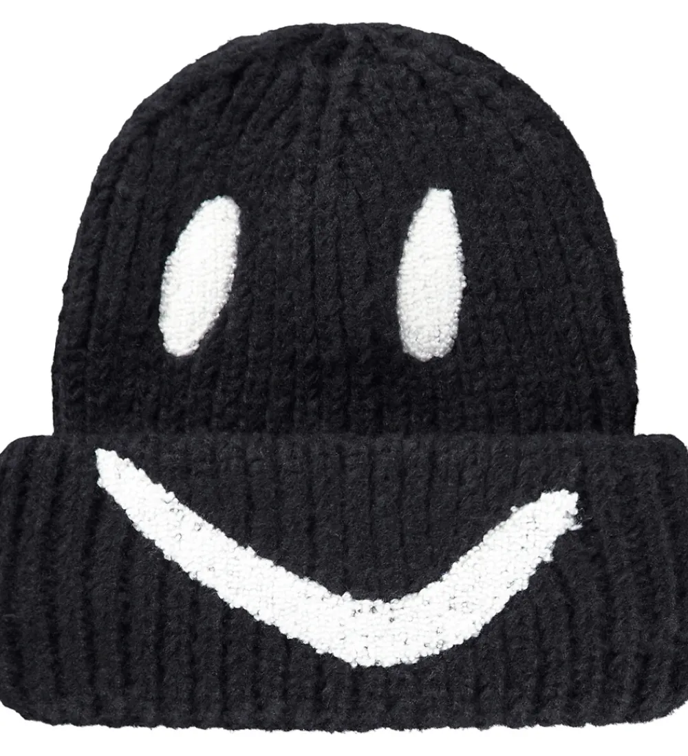 Fed Molo hue i sort med en ribstruktur og dekoreret med en stor smiley i hvidt frotté