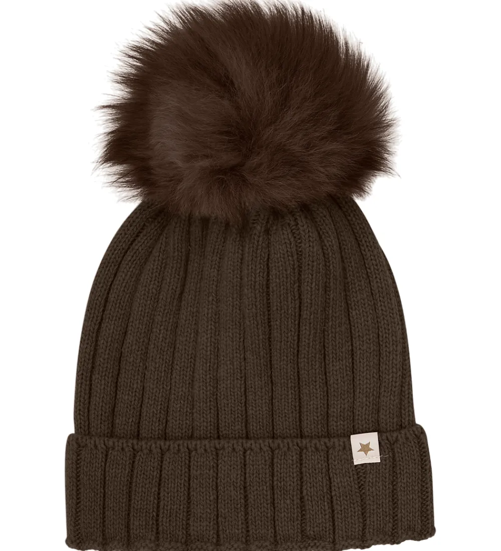 Elegant hue fra Huttelihut, strikket i meleret mørkebrun med smuk ribstruktur. På toppen prydes huen af en stor, blød kvast i mørkebrun, fremstillet af ægte alpakapels.