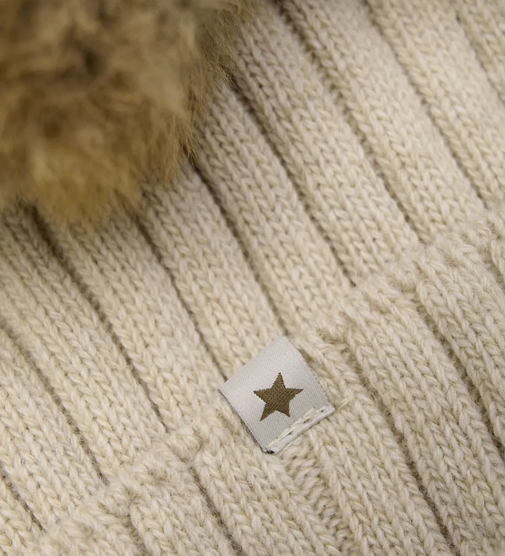 Smart hue fra Huttelihut, strikket i meleret lysebeige med smuk ribstruktur. På toppen prydes huen af en stor, blød kvast i lysebrun, fremstillet af ægte alpakapels.