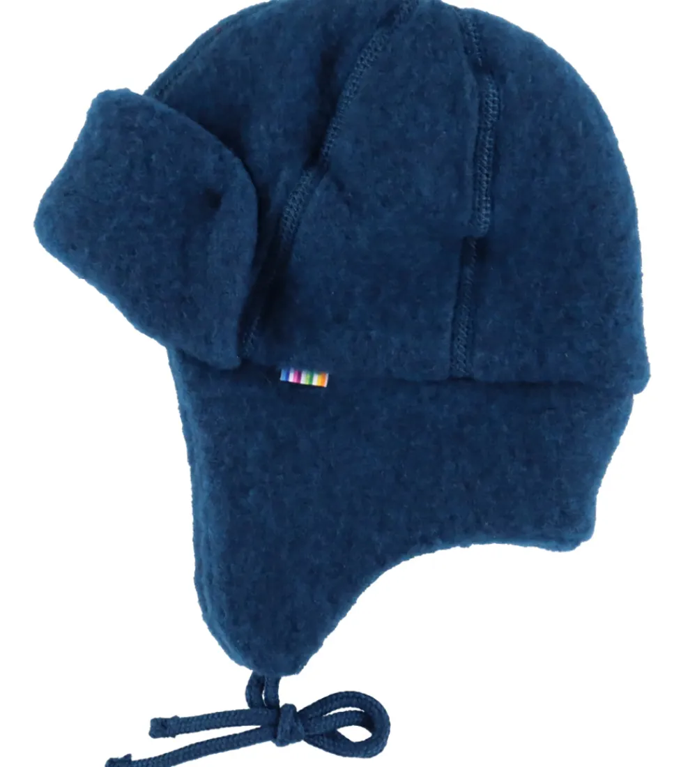 Joha huen fremstillet af en kraftig, filtet merinouldskvalitet, der kan holde barnets hoved dejligt varmt på de kølige dage.