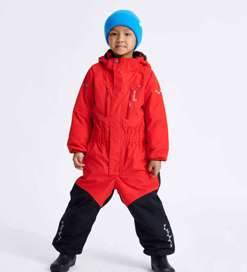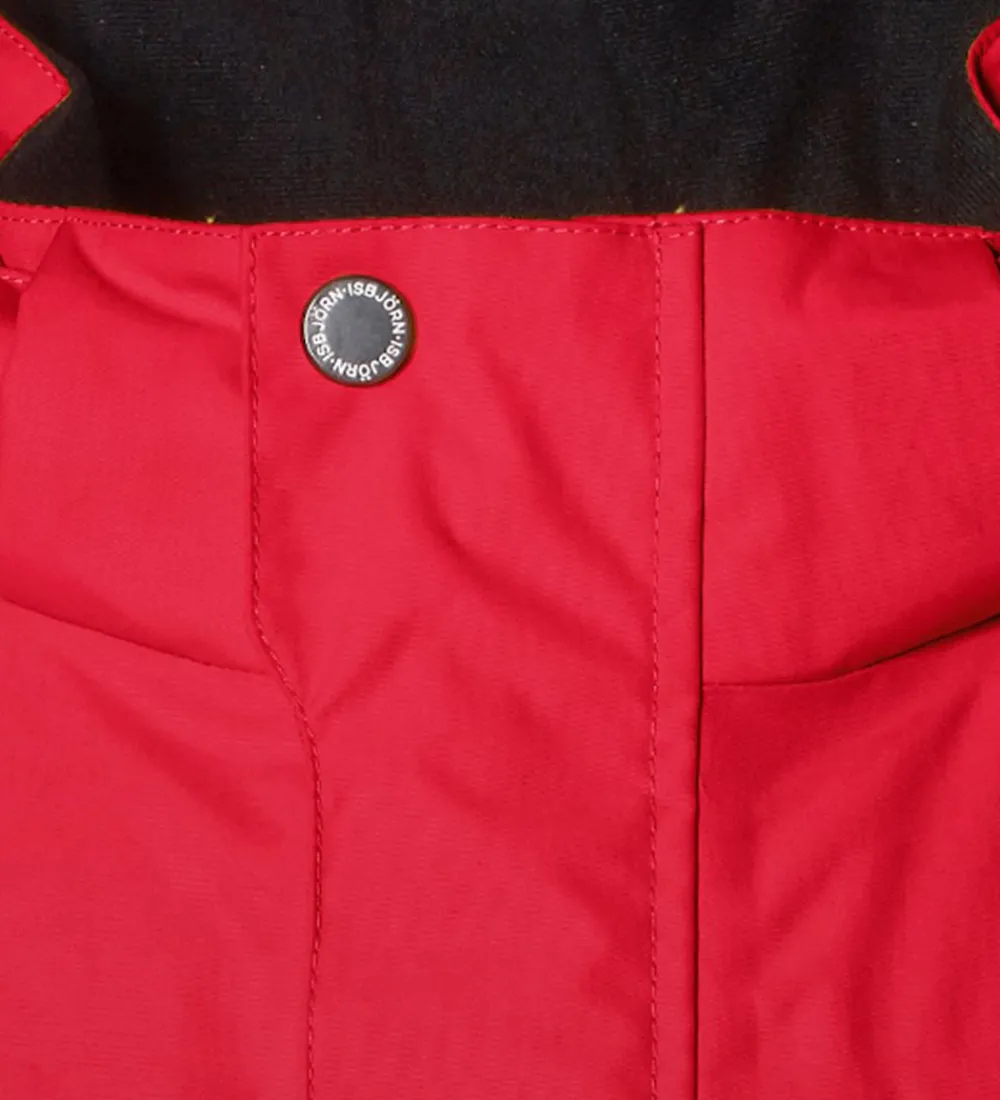 Flot Isbjörn Of Sweden flyverdragt i rød og sort. Flyverdragten har hvide logoprint på venstre bryst og hætten samt smarte refleksprint på lænden, begge skuldre og ankler.