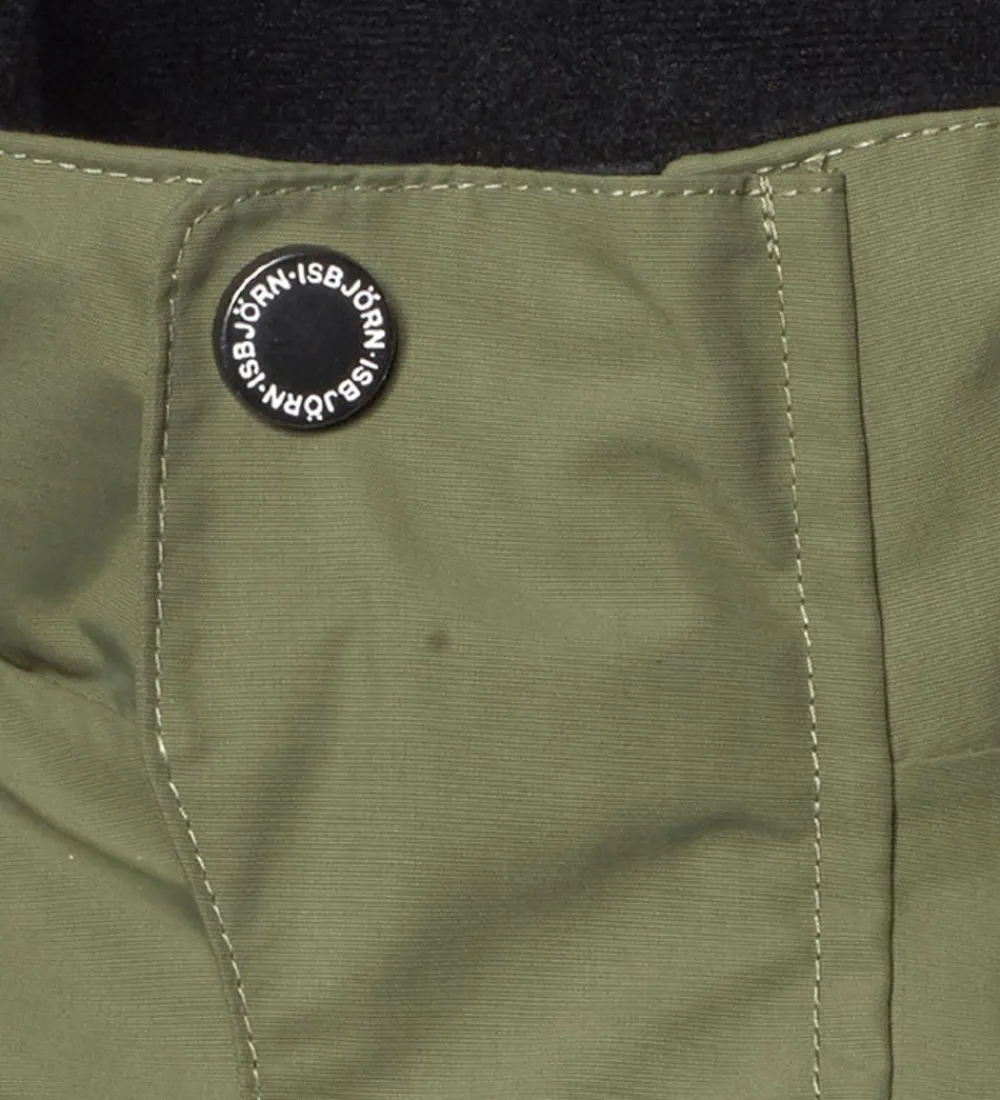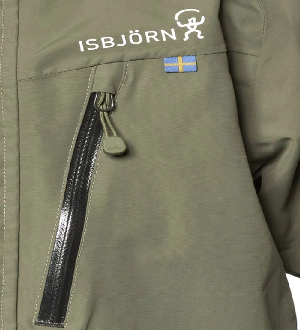 Lækker Isbjörn Of Sweden skaljakke i armygrøn med sorte lynlåse. Skaljakken har hvide logoprint på venstre bryst og hætten samt smarte refleksprint på lænden og begge skuldre.