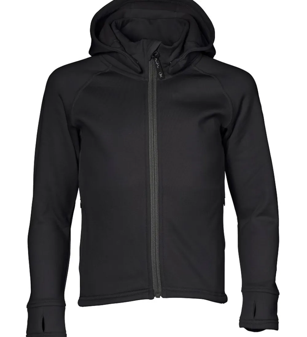 Isbjörn Of Sweden softshelljakken har en fast hætte med en høj hals og lange ærmer med brede kanter, hvor der også er et lille hul i tommelfingeren. Softshelljakken åbnes fortil ved hjælp af en lynlås med hagebeskytter og indvendig vindstolpe.