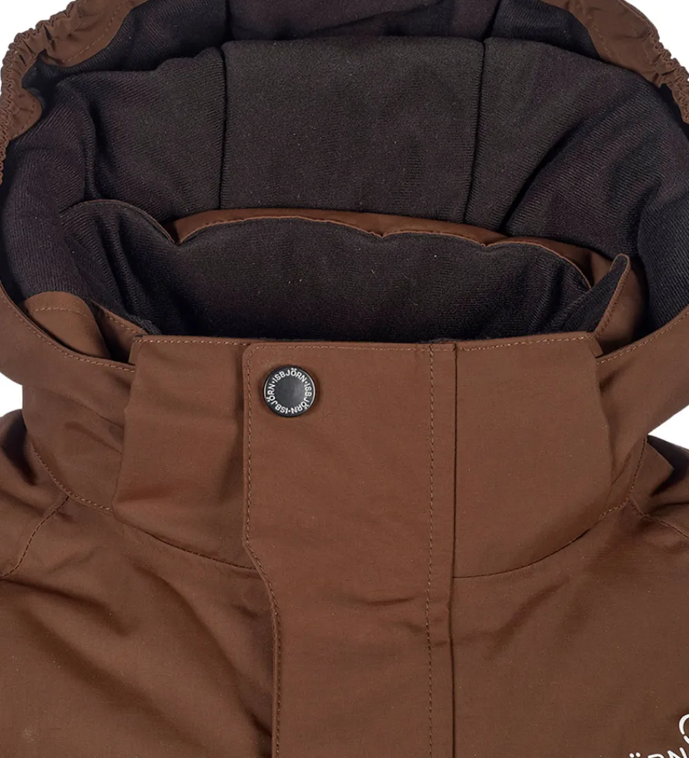 Flot Isbjörn Of Sweden vinterjakke i brun. Vinterjakken har hvide logoprint på venstre bryst og hætten samt smarte refleksprint på lænden og højre skulder.