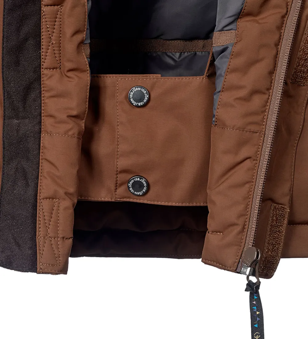 Ærmernes åbninger har praktiske elastikkanter, der kan strammes ind med velcroremme, og snefang med brede, elastiske kanter. På venstre overarm er der en lynlåslomme.