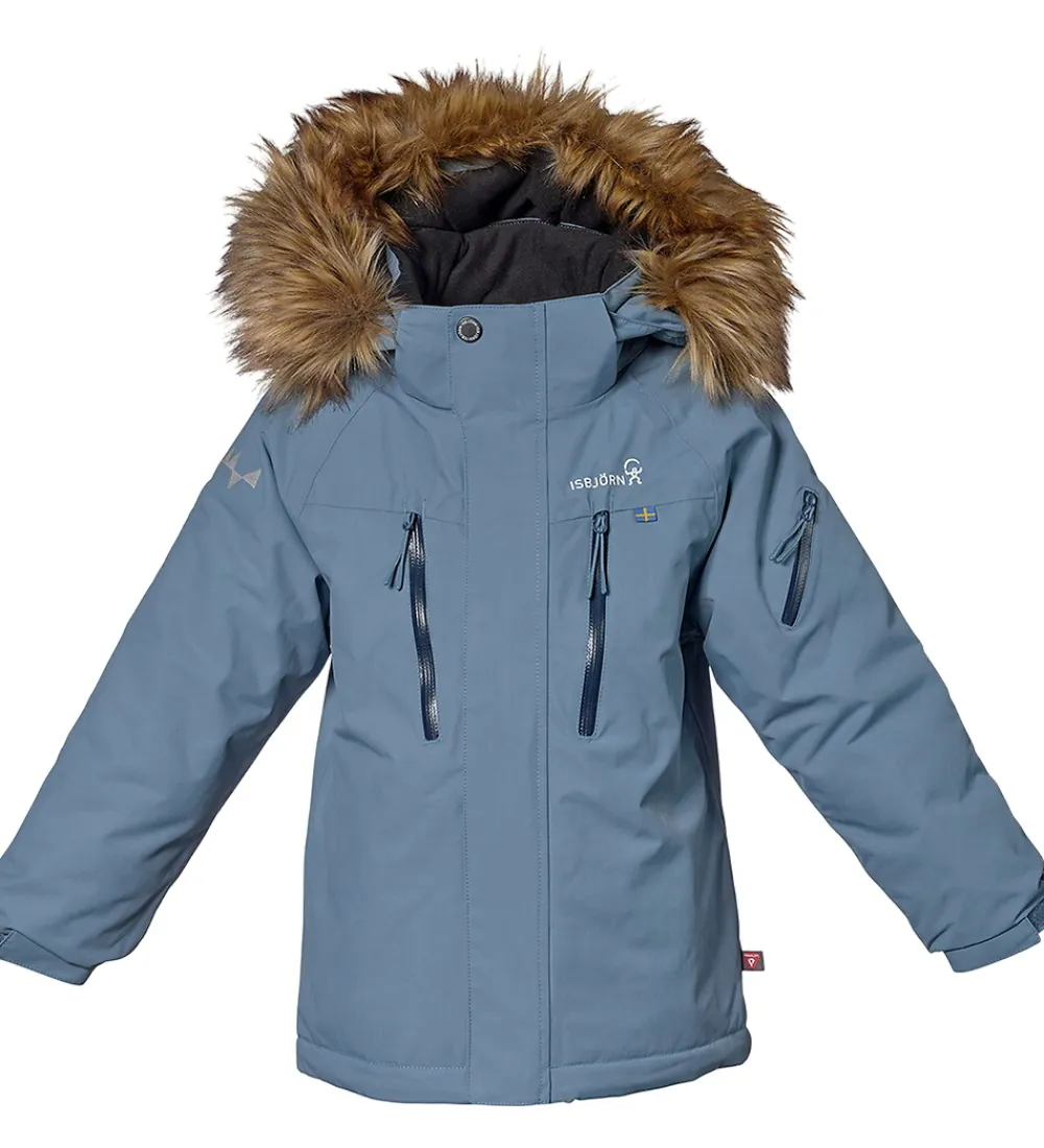 Lækker Isbjörn Of Sweden vinterjakke i støvet blå. Vinterjakken har hvide logoprint på venstre bryst og hætten samt smarte refleksprint på lænden og højre skulder.