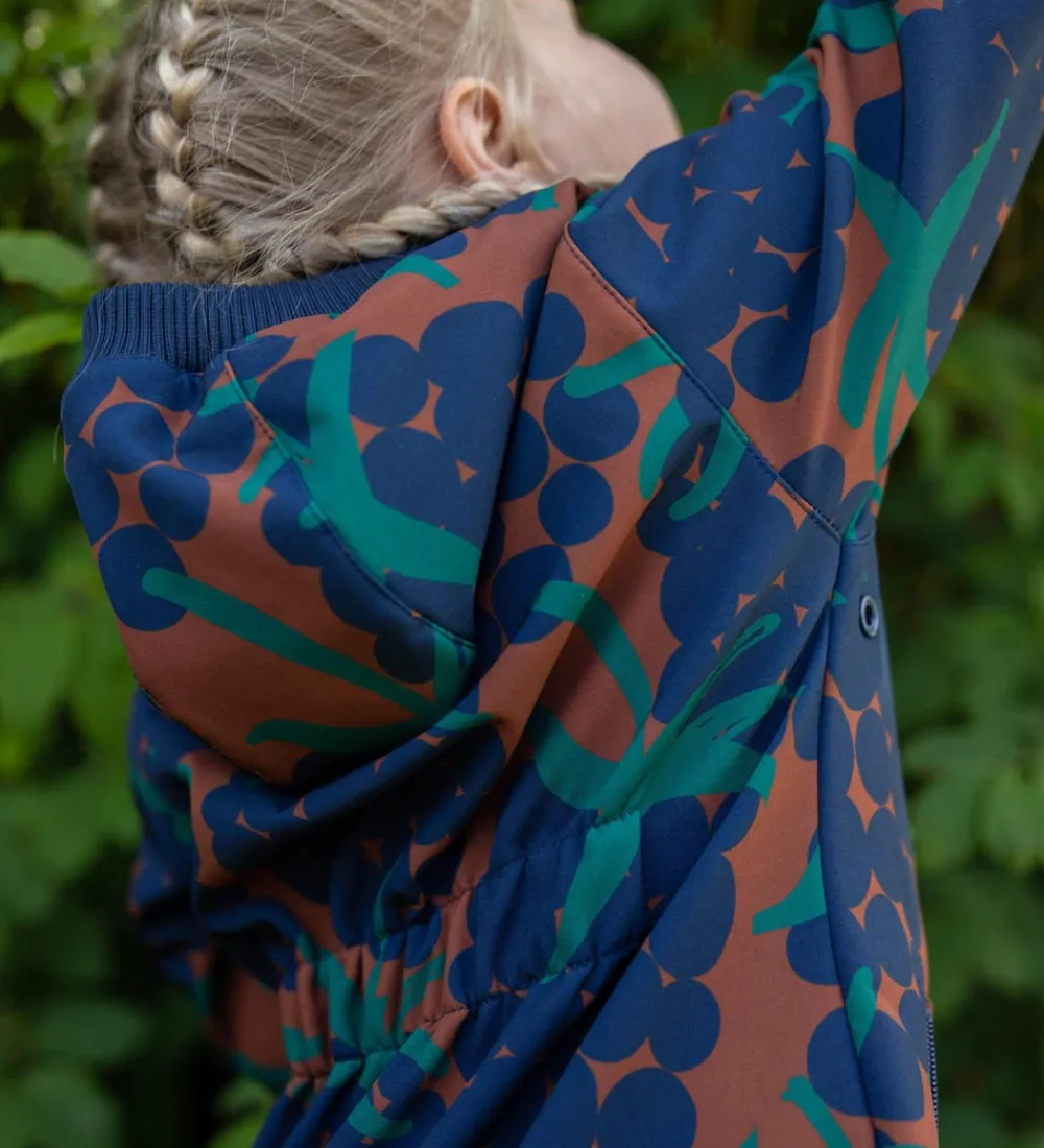 Skøn Danefæ softshelljakke i brun med et alloverprint med navyfarvede bær og mørkegrønne blade.