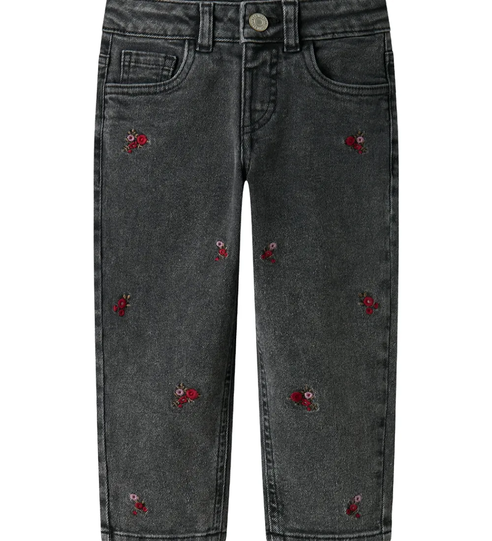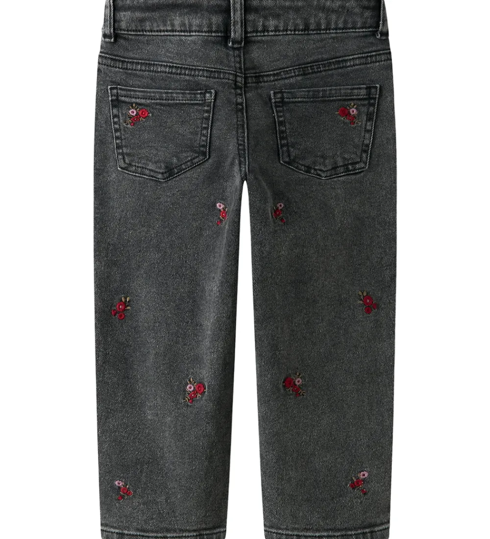 Charmerende Name It jeans i mørkegråt denim i en strækbar kvalitet og med smukke blomsterbroderier spredt over hele designet. Name It jeansene lukkes med en trykknap, og i livet har de en justerbar elastikkant. Både fortil og bagpå er der praktiske lommer.