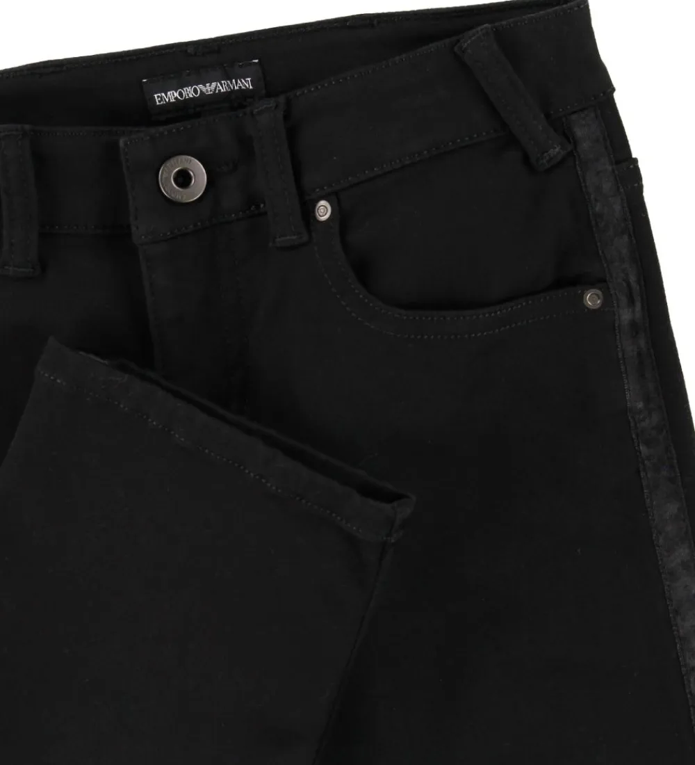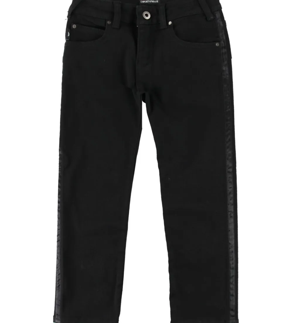 Lækre Emporio Armani jeans i ensfarvet sort og i en strækbar kvalitet. I siderne er der ned langs buksebenene en smal sort kant i glatvævet kvalitet.