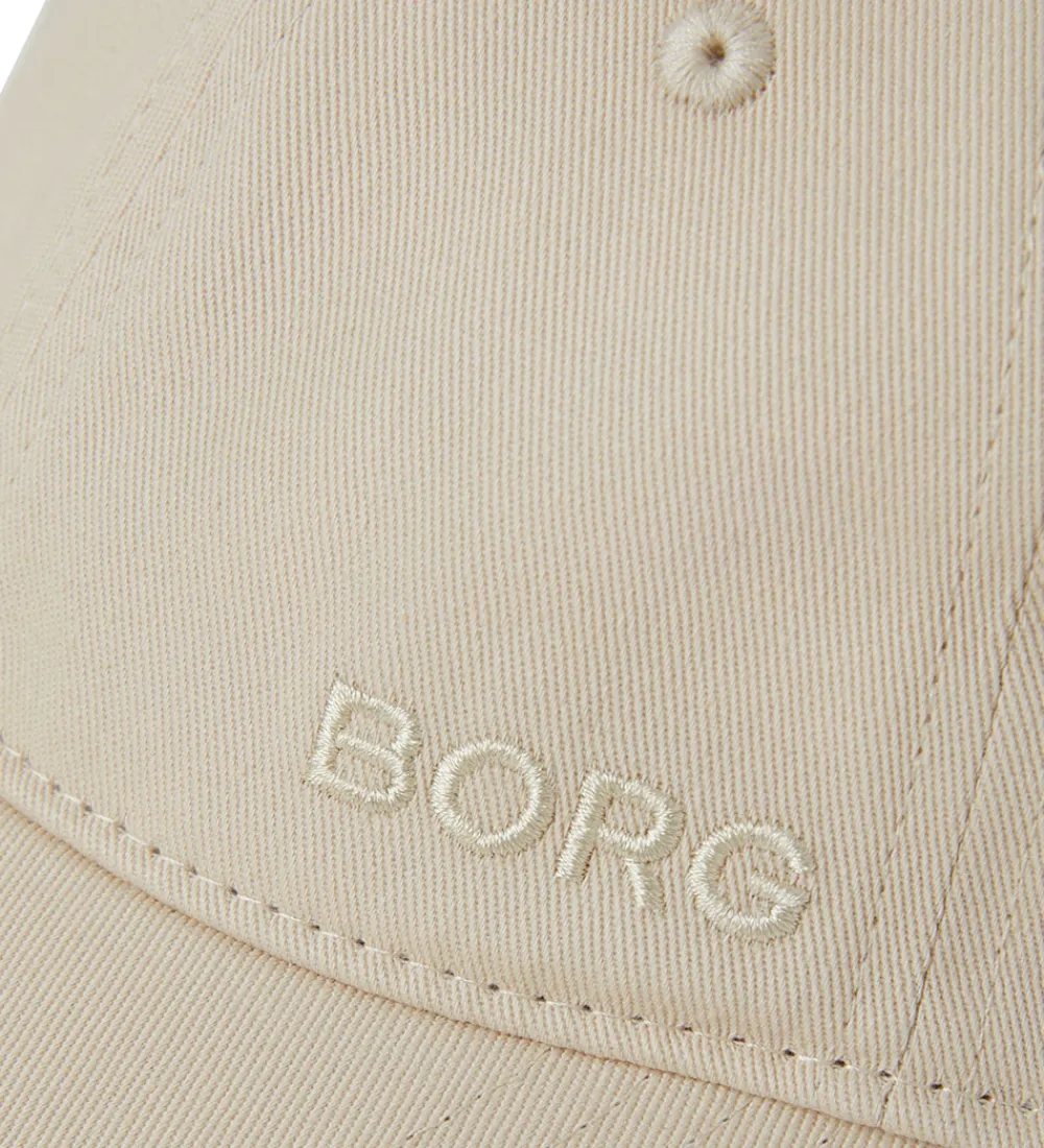 Flot Björn Borg kasket i beige, og fortil til venstre står der “Borg” med småt, broderede bogstaver i beige. Logoet “Björn Borg” er også broderet i beige bagpå kasketten, lige over spænden.