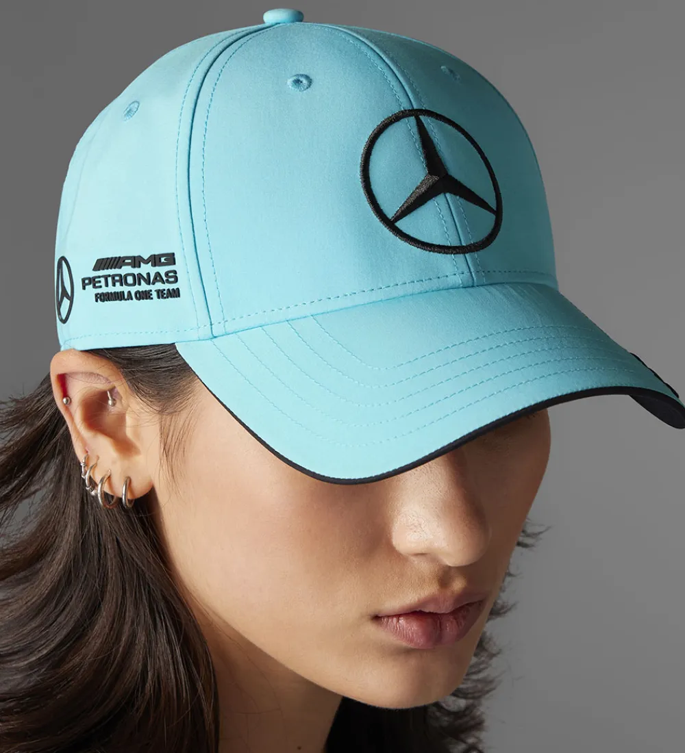 Frisk adidas Performance kasket i en lys blå nuance med et stort Mercedes-logo i sort på fronten. Kasketten har en klassisk pasform og er designet til at give en moderne og sporty stil.