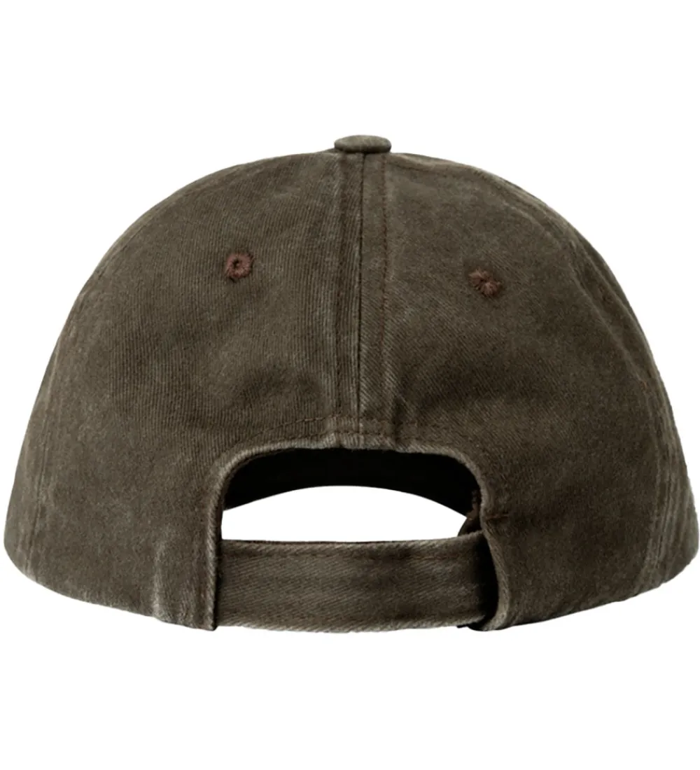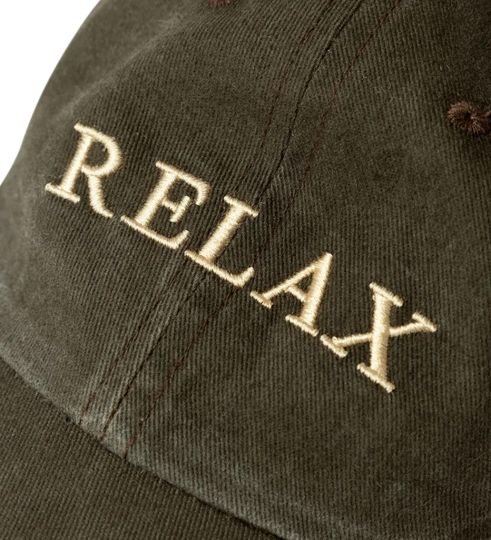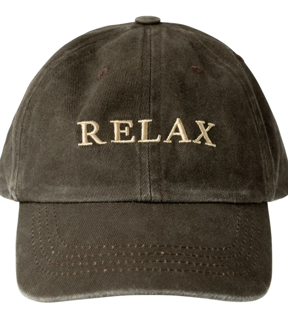 Smart Name It kasket i brun twill med et flot vasket look samt ordet “Relax” broderet i beige fortil.