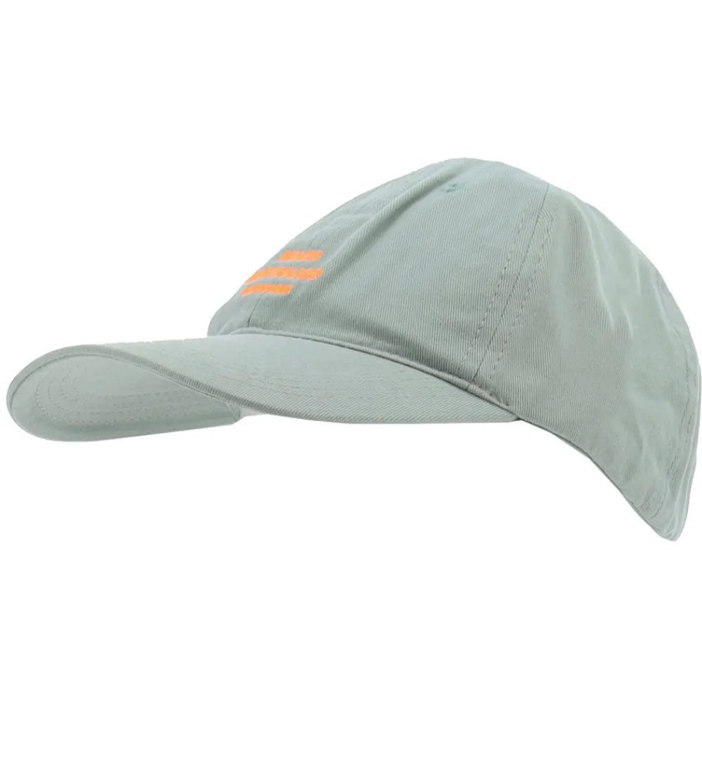 Skøn Mads Nørgaard kasket i støvet grøn, med et broderet logo fortil i neon orange.