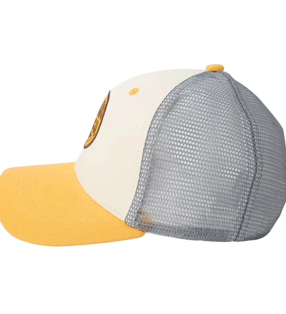 Flot Lil’ Boo kasket i beige med et gråt net, samt en gul skygge og detaljer. Fortil er der en fin logoapplikation.