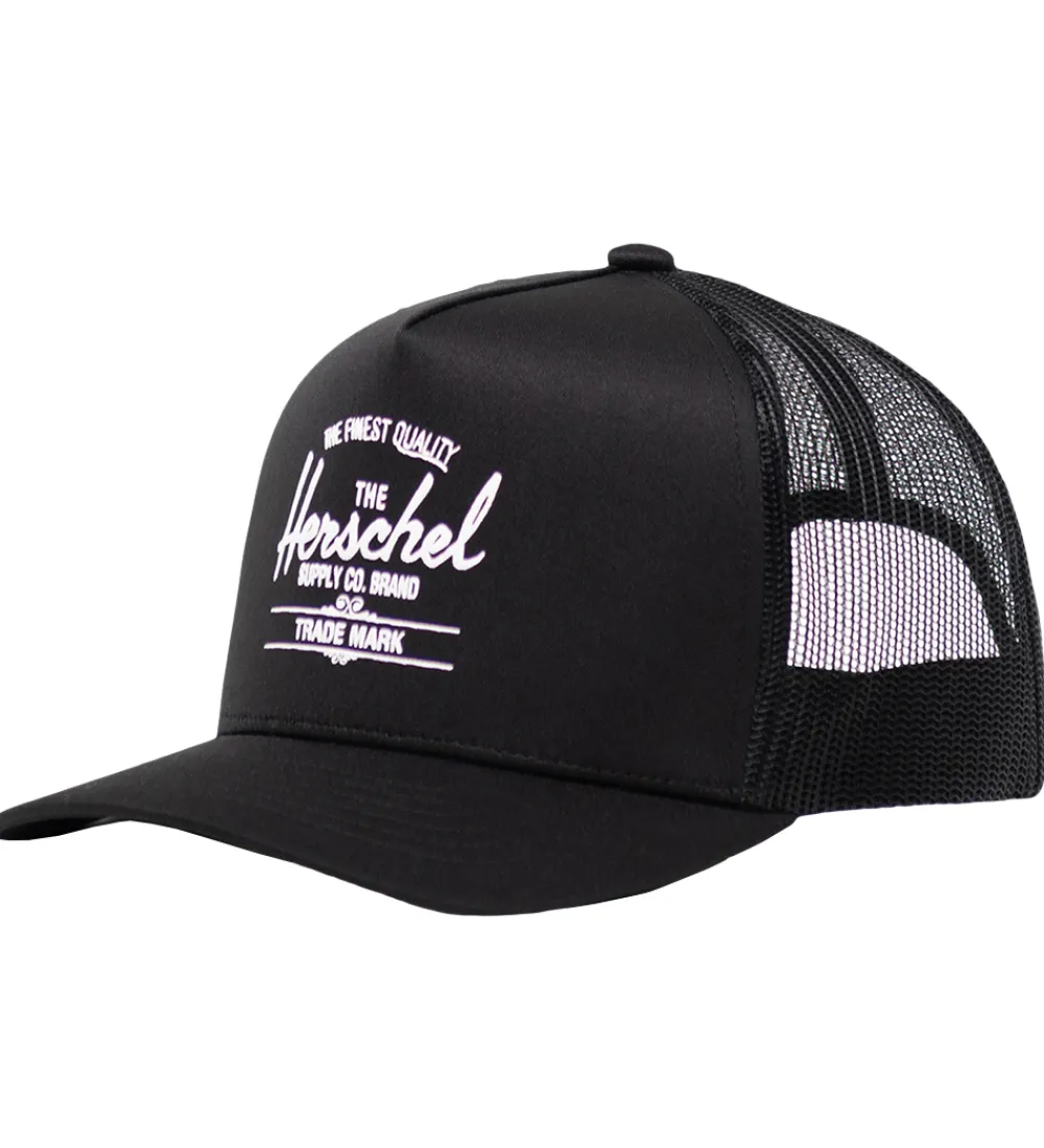 Lækker Herschel kasket i sort med hvidt logoprint på fronten og sort net bagtil. Kasketten har en buet skygge og kan justeres med en plastiklukning i nakken.