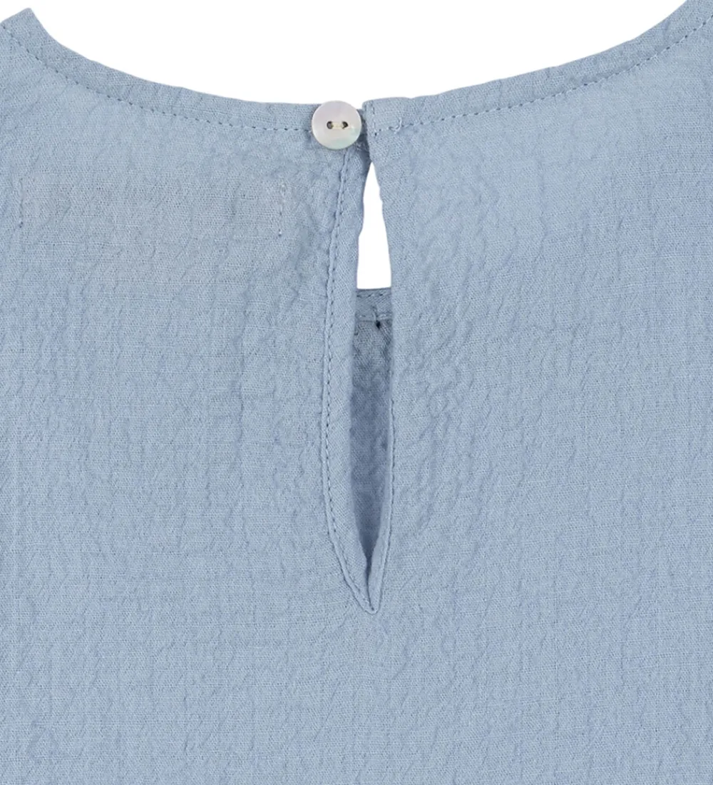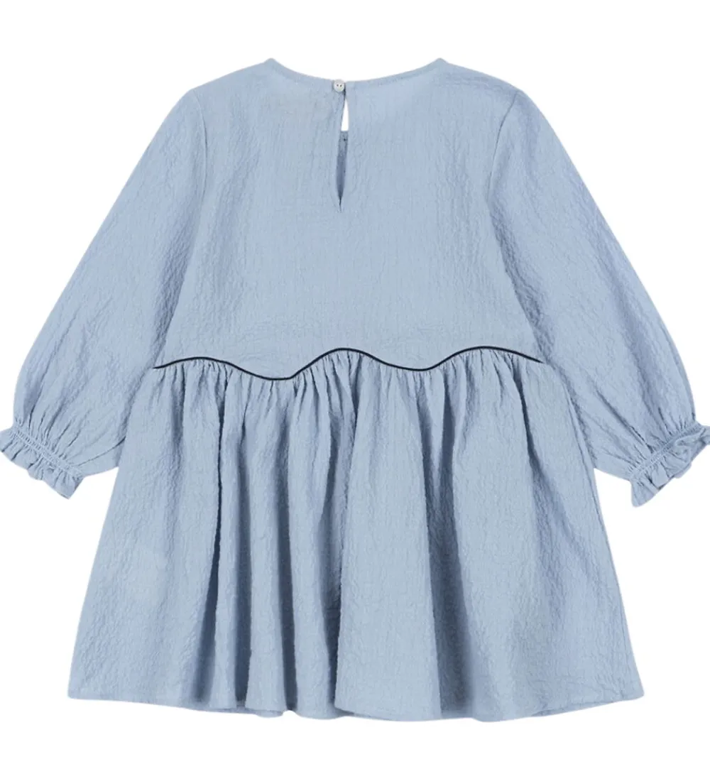 Elegant Konges Sløjd kjole i en sart, lyseblå farve. Kjolen har lange ærmer og en fin, bølget kant ved taljen. En mørkeblå sløjfe pryder halsudskæringen, og den har elastiske detaljer ved håndleddene. Konges Sløjds design fremhæver en enkel men yndefuld stil.
