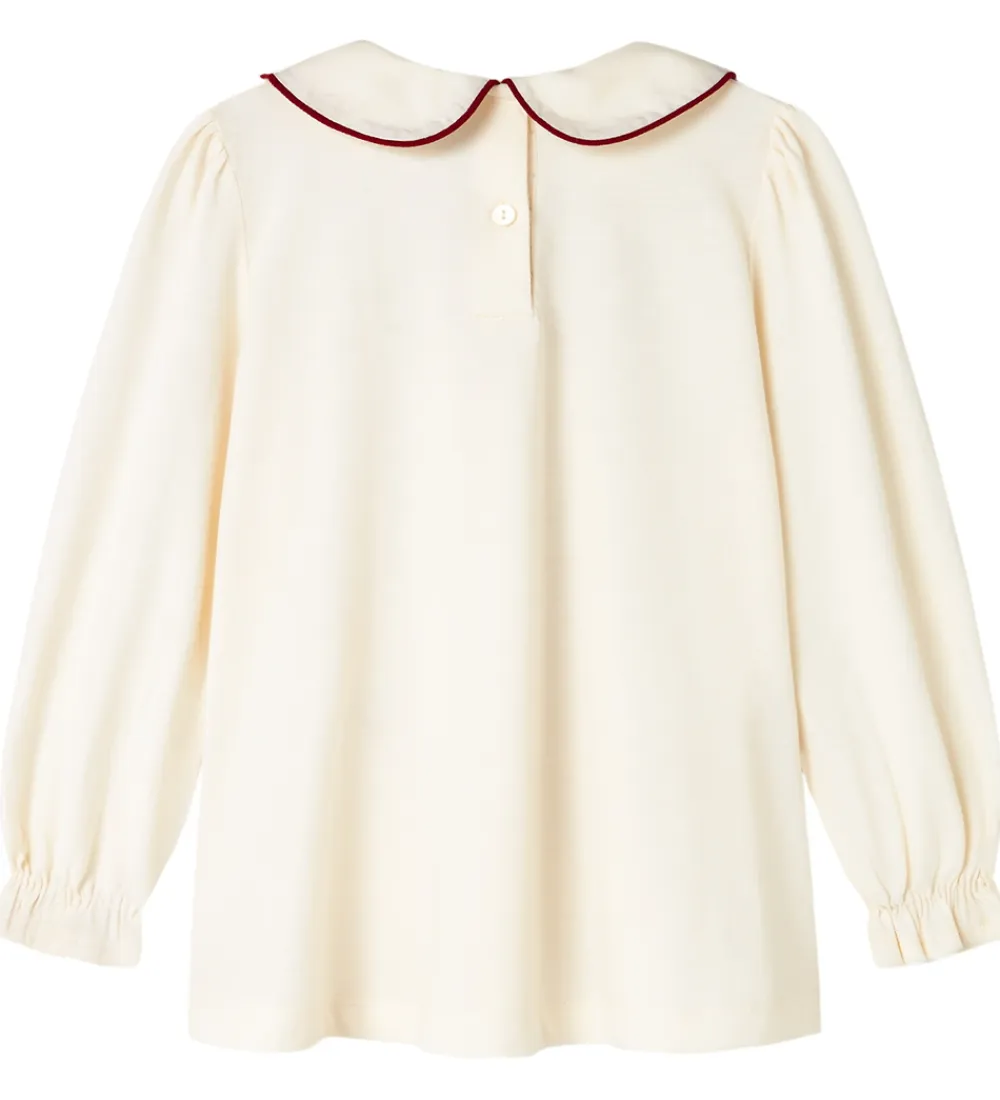 Elegant MarMar kjole i en blød, cremefarvet nuance. MarMar kjolen har lange ærmer og en rund krave med broderede blomsterdetaljer i røde og grønne nuancer. Det enkle design suppleres af fine rynker ved skuldrene og elastiske manchetter, der skaber et delikat look.