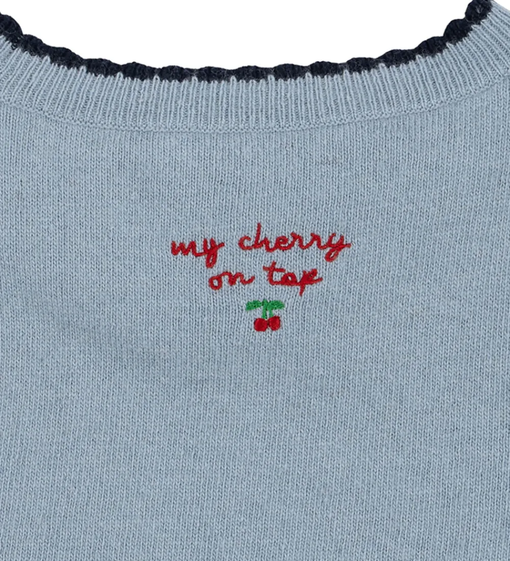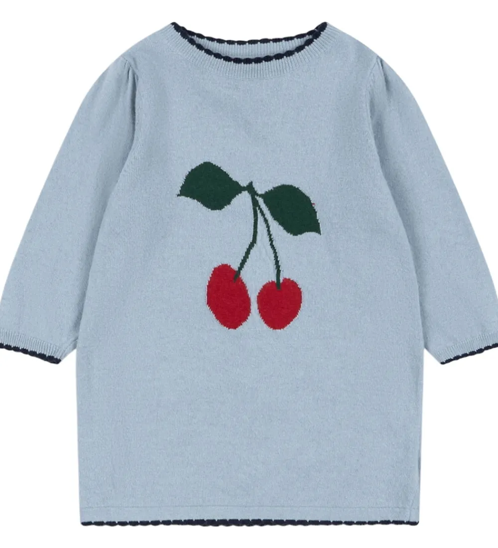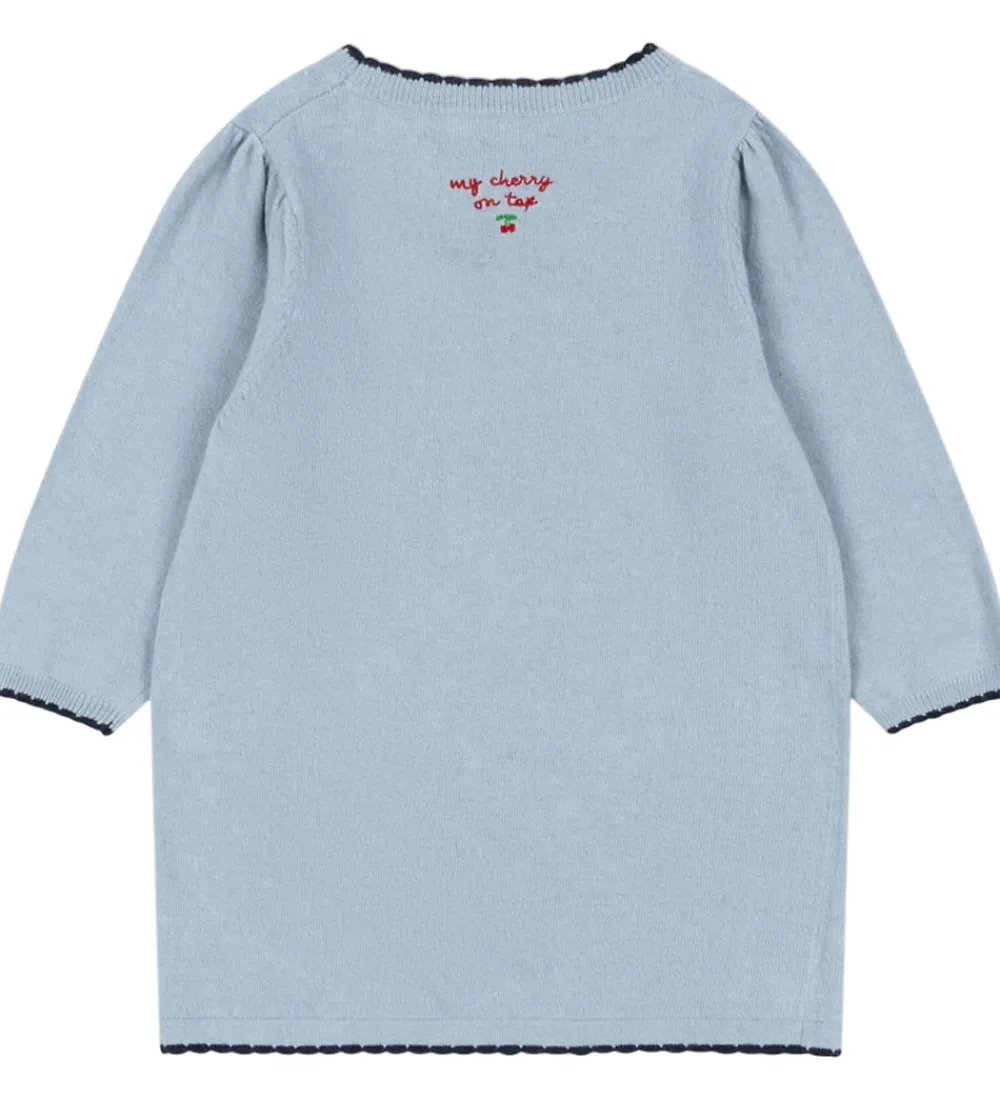 Elegant Konges Sløjd kjole strikket i en blød, blå nuance. Kjolen har lange ærmer og prydes af et simpelt, rødt kirsebærmotiv på forsiden. Konges Sløjd kjolen afsluttes med mørkeblå kanter ved hals, ærmer og bund.