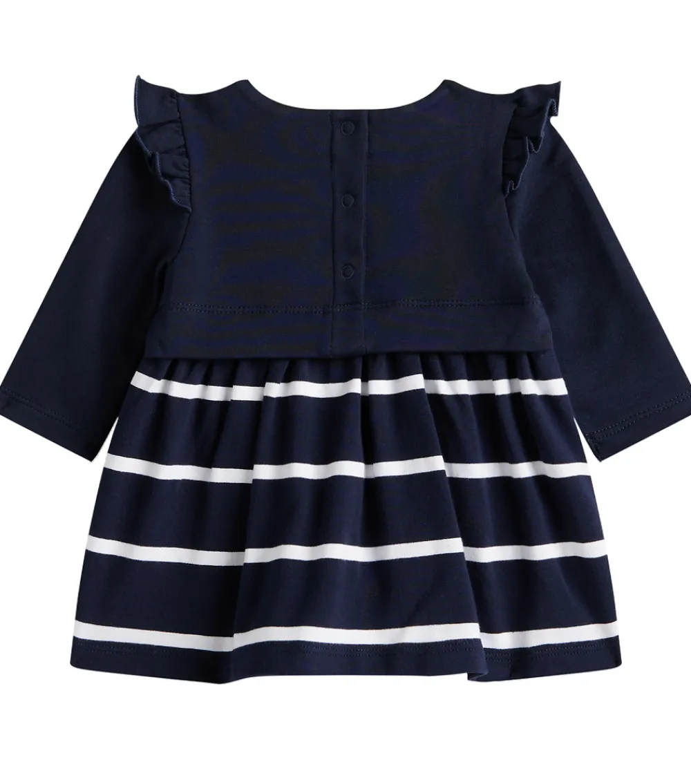 Elegant Tommy Hilfiger kjole i en mørkeblå farve. Kjolen har lange ærmer og fine flæsedetaljer ved skuldrene. Det nederste af kjolen er prydet med vandrette, hvide striber. Tommy Hilfiger kjolen har en rund halsudskæring og en diskret logoapplikation foran. I nakken findes tre trykknapper, som sikrer let af- og påklædning.