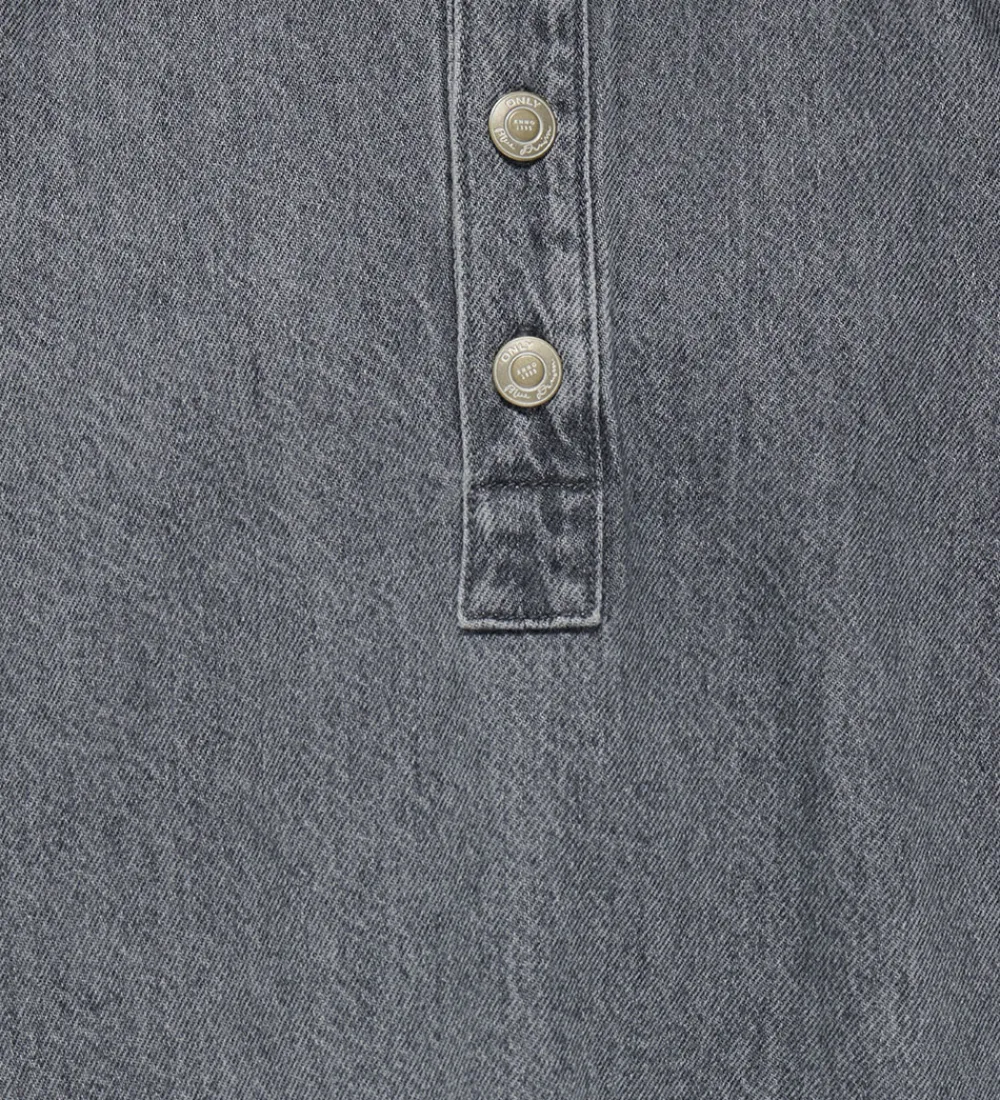 Elegant Kids Only kjole i gråt, stonewashed denim i en fastvævet kvalitet. Kjolen har 3/4 lange ærmer, og den har en klassisk krave. Foran har Kids Only kjolen en knaplukning med sølvfarvede knapper, og den har et flot A-snit med en en god vidde.