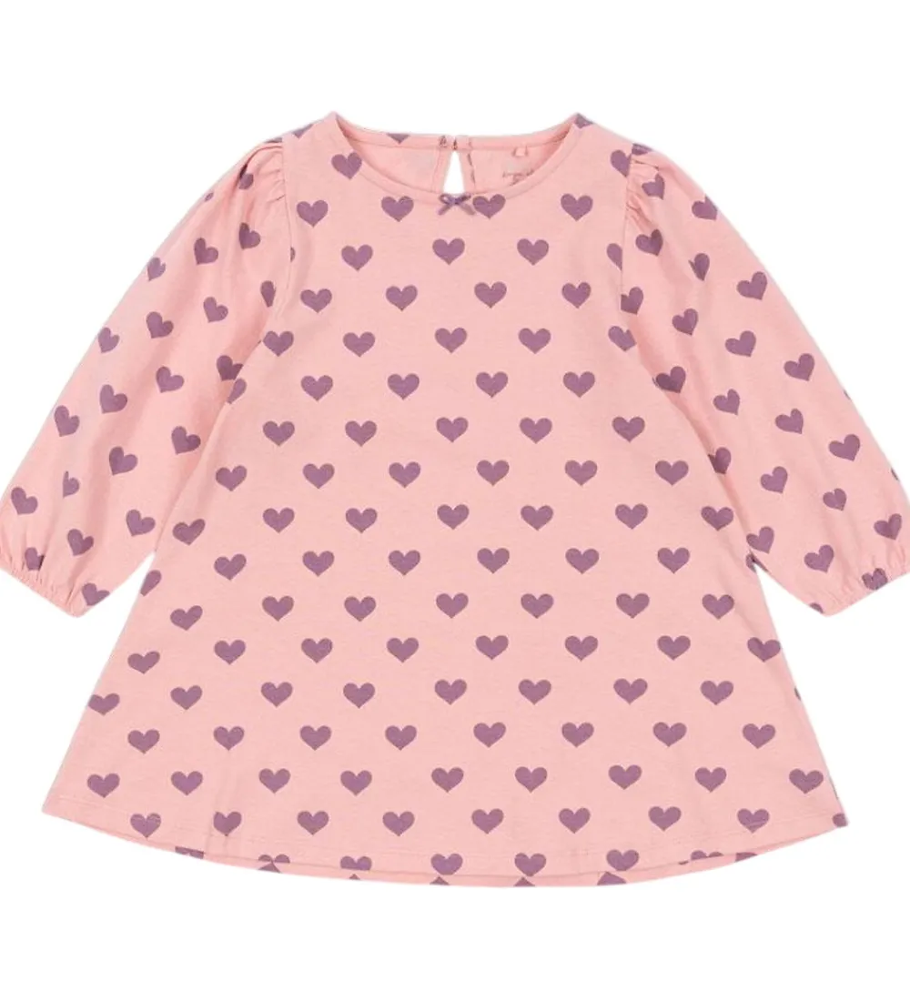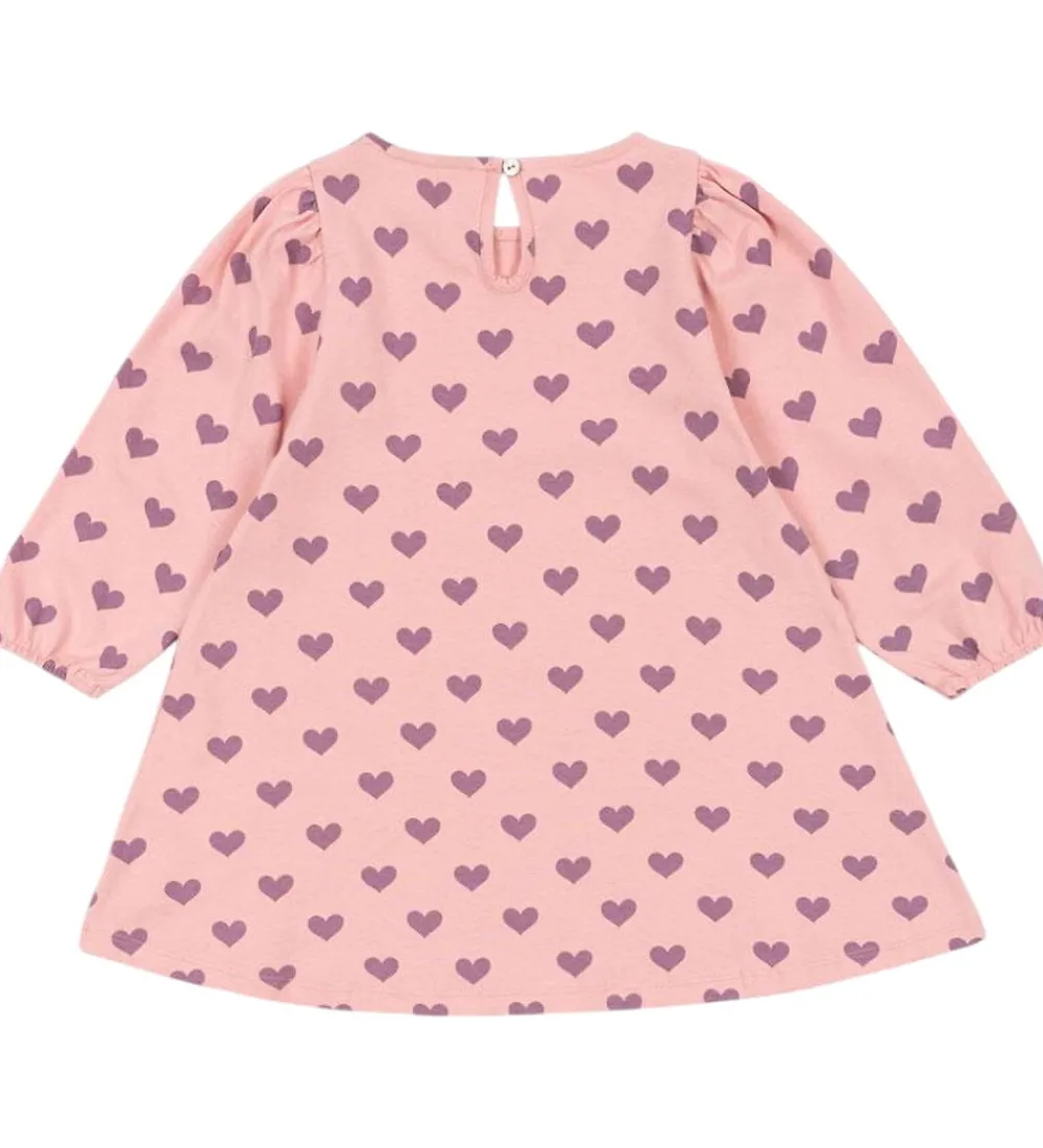 Indbydende Konges Sløjd kjole i en sart, rosa nuance dekoreret med små, lilla hjerter. Kjolen har lange ærmer med let puf og rund halsudskæring. Konges Sløjd kjolen er lavet med en blød struktur, der skaber et behageligt udtryk.
