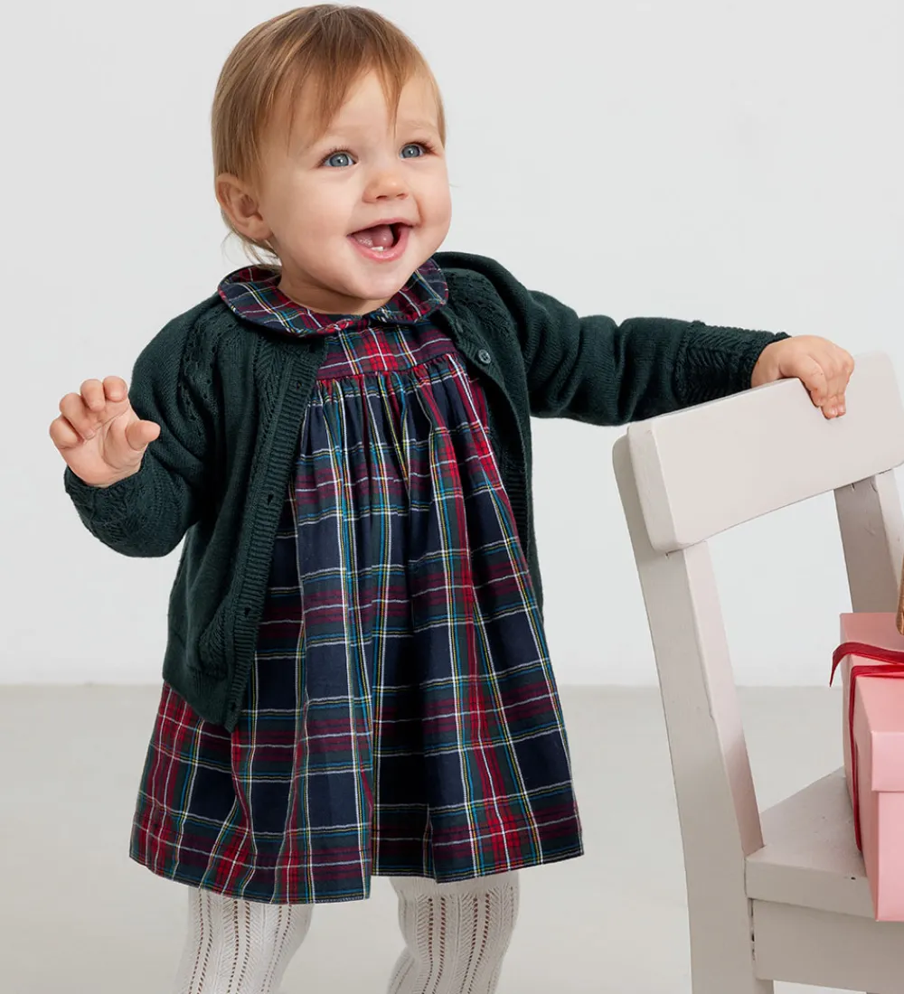Elegant MarMar kjole i et klassisk, ternet mønster med nuancer af blå, rød og hvid. Kjolen har lange ærmer med små flæsedetaljer ved ærmekanten. Den har en fin krave og en løs, rummelig pasform, der falder let fra brystet.
