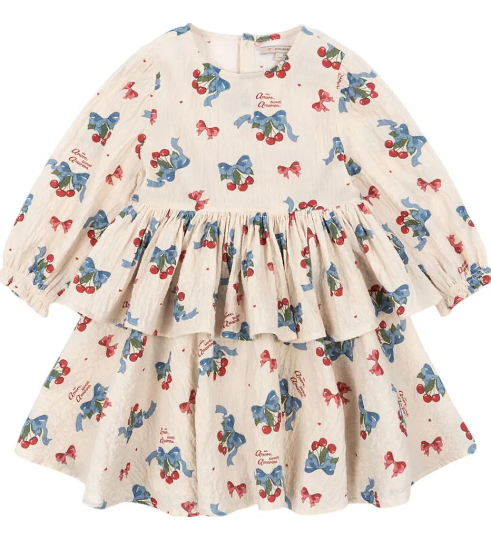 Kjolen er dekoreret med et mønster af kirsebær, blå sløjfer og små, røde hjerter. Foroven har kjolen et raffineret skørt, der skaber en fin lag-på-lag effekt. Konges Sløjd kjolen har en rund halsudskæring og lukker med knapper i nakken.