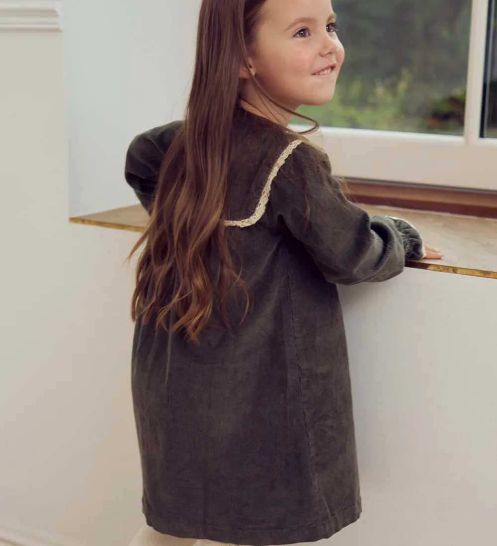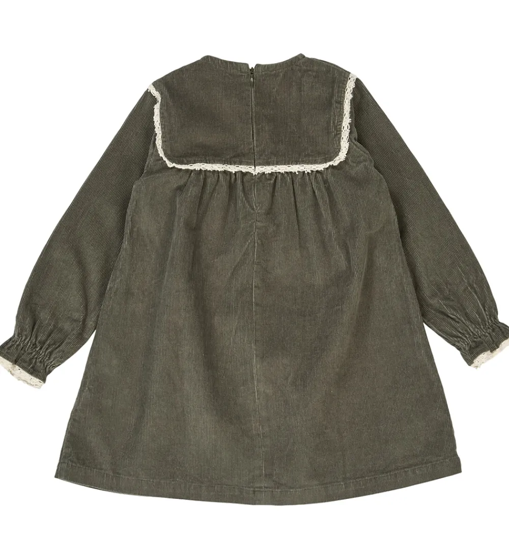 Flot Müsli kjole i afdæmpet grønt fløjl i en fastvævet kvalitet og en fine, hvide blondedetaljer.