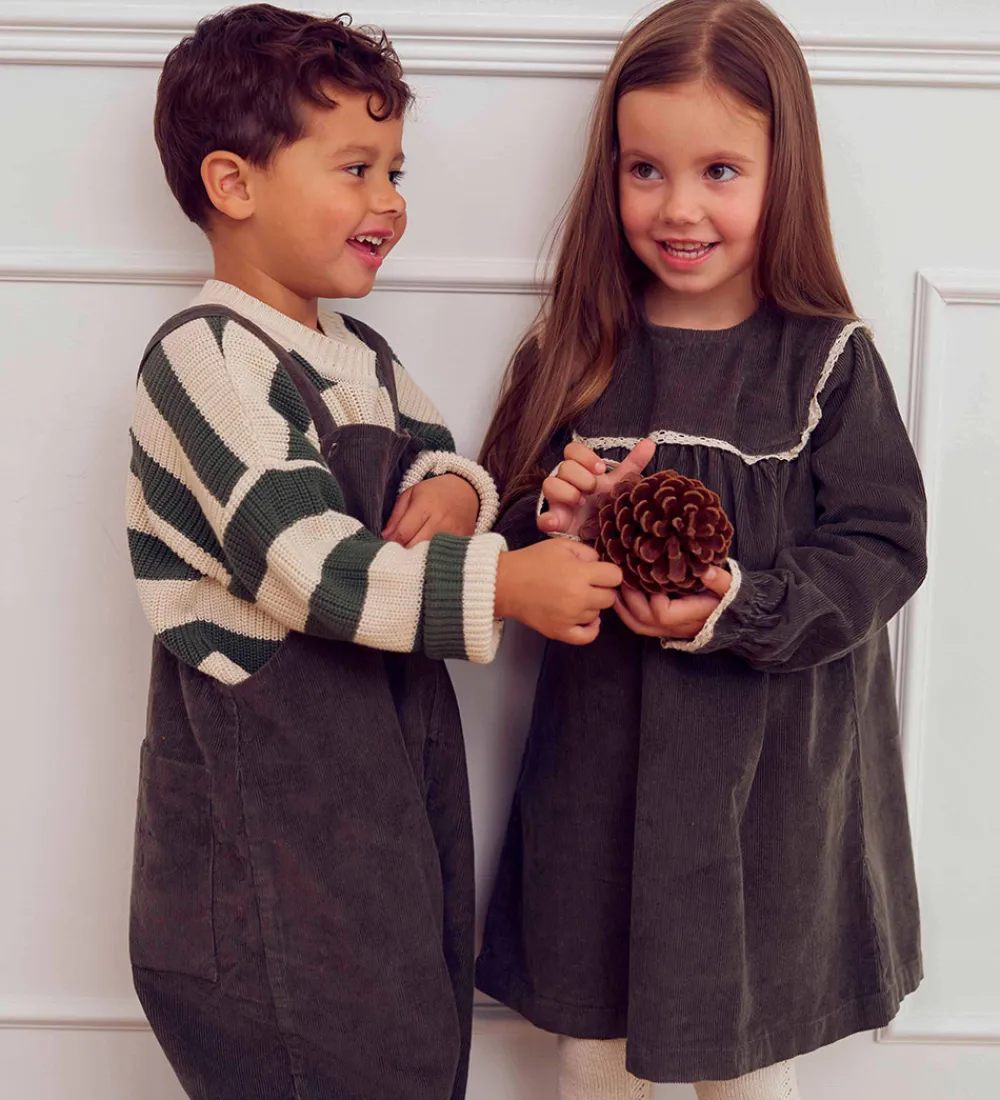 Müsli kjolen har lange ærmer med smalle elastikkanter med flæseafslutninger, og den har et flot A-snit med en god vidde og flotte rynkedetaljer. Kjolen lukkes i nakken med en skjult lynlås.