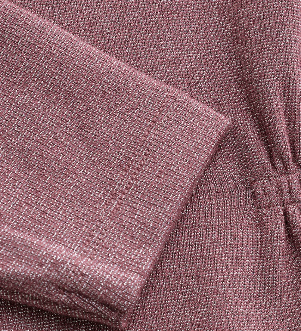 Elegant kjole fra Minymo i rosa med glimmer. Kjolen har fin ribstruktur og en rund halsudskæring med trykknapper ved venstre skulder. Den har lange ærmer med puf ved skuldrene, og i taljen er der elastik i siderne, som giver et figursyet snit.