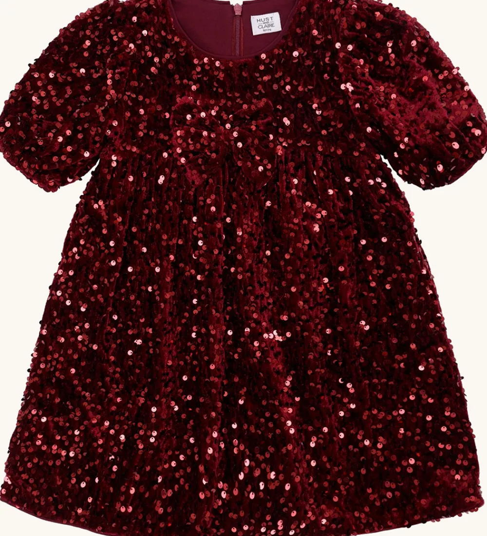 Elegant Hust and Claire kjole i dyb rød velour dekoreret med fine pailletter. Hust and Claire kjolen har korte ærmer med elastikkanter og pufskuldre, og den har en god vidde. Fortil sidder der en stor sløjfe. Kjolen lukkes i ryggen med en skjult lynlås.