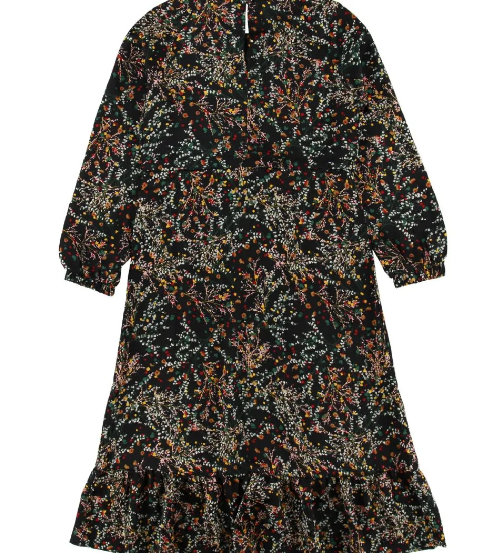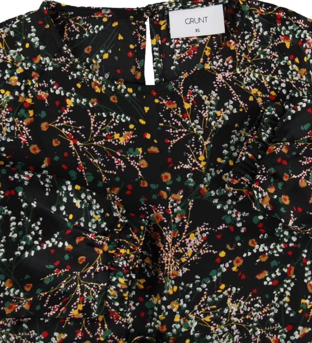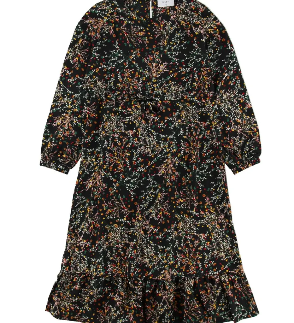 Skøn Grunt kjole i sort med et flot blomstermønster i grønne, hvide, gule og røde nuancer.