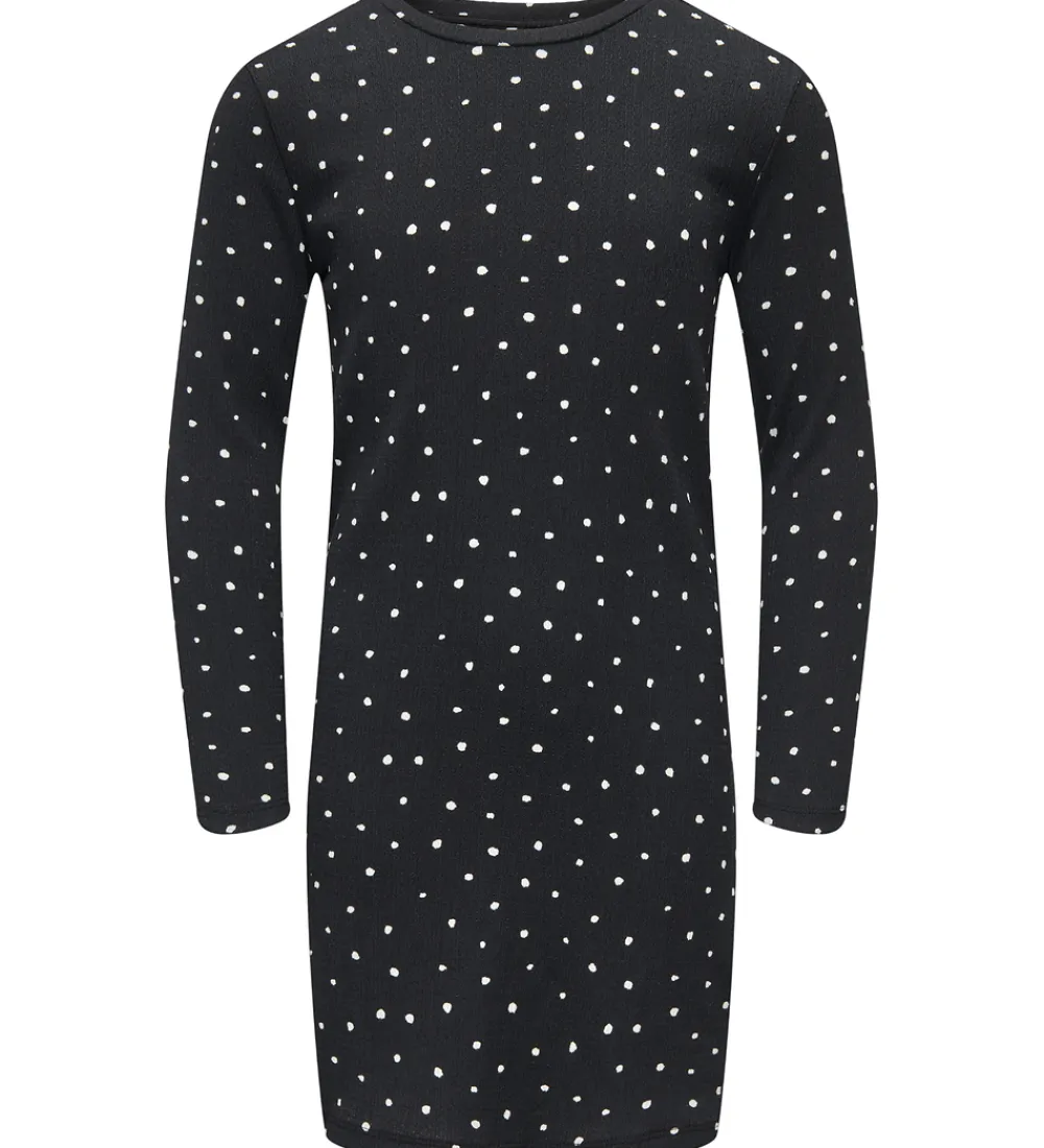 Stilfuld kjole fra Kids Only i sort med hvide prikker og flot struktur. Kids Only kjolen har lange ærmer og en rund halsudskæring, der giver et enkelt og tidløst udtryk. Kjolen har et flot figursyet snit.