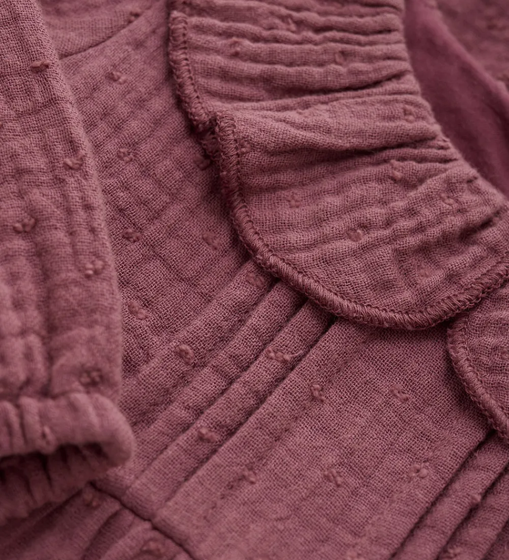 Elegant En Fant kjole i mørk rosa musselin med en prikket struktur. En Fant kjolen har lange ærmer med smalle elastikkanter og en fin krave med flæser. Kjolen har en løs pasform, og den består af to lag. Kjolen lukkes i nakken med hvide knapper.