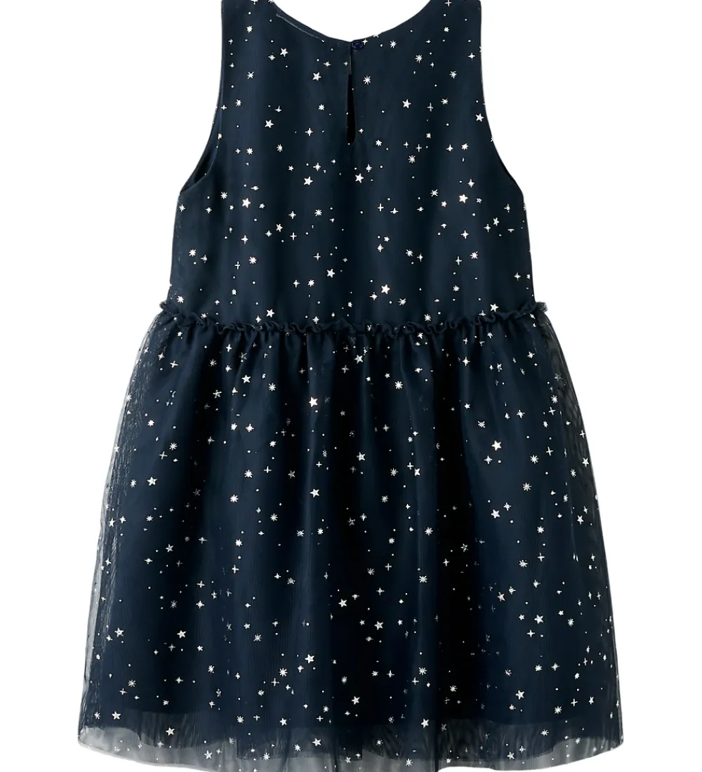 Elegant Name It kjole i navyblå med print af små stjerner i sølv glimmer. Name It kjolen er ærmeløs og har en rund halsudskæring med en knap i nakken. Kjolen består af et lag polyester inderst og flere lag tyl yderst.