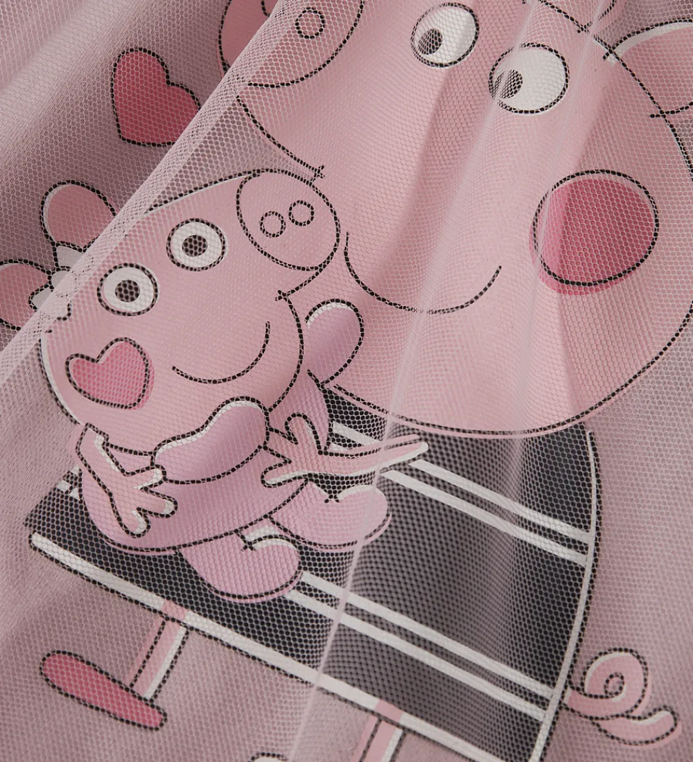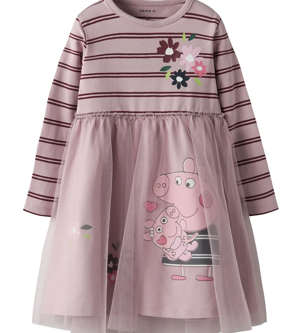 Flot Name It kjole i rosa med vandrette, bordeauxrøde striber. Name It kjolen har et skørt bestående af et lag bomuld og et lag tyl, hvor der er print af to Gurli Gris karakterer og blomster på det inderste lag. Kjolen har en rund halsudskæring og lange ærmer.