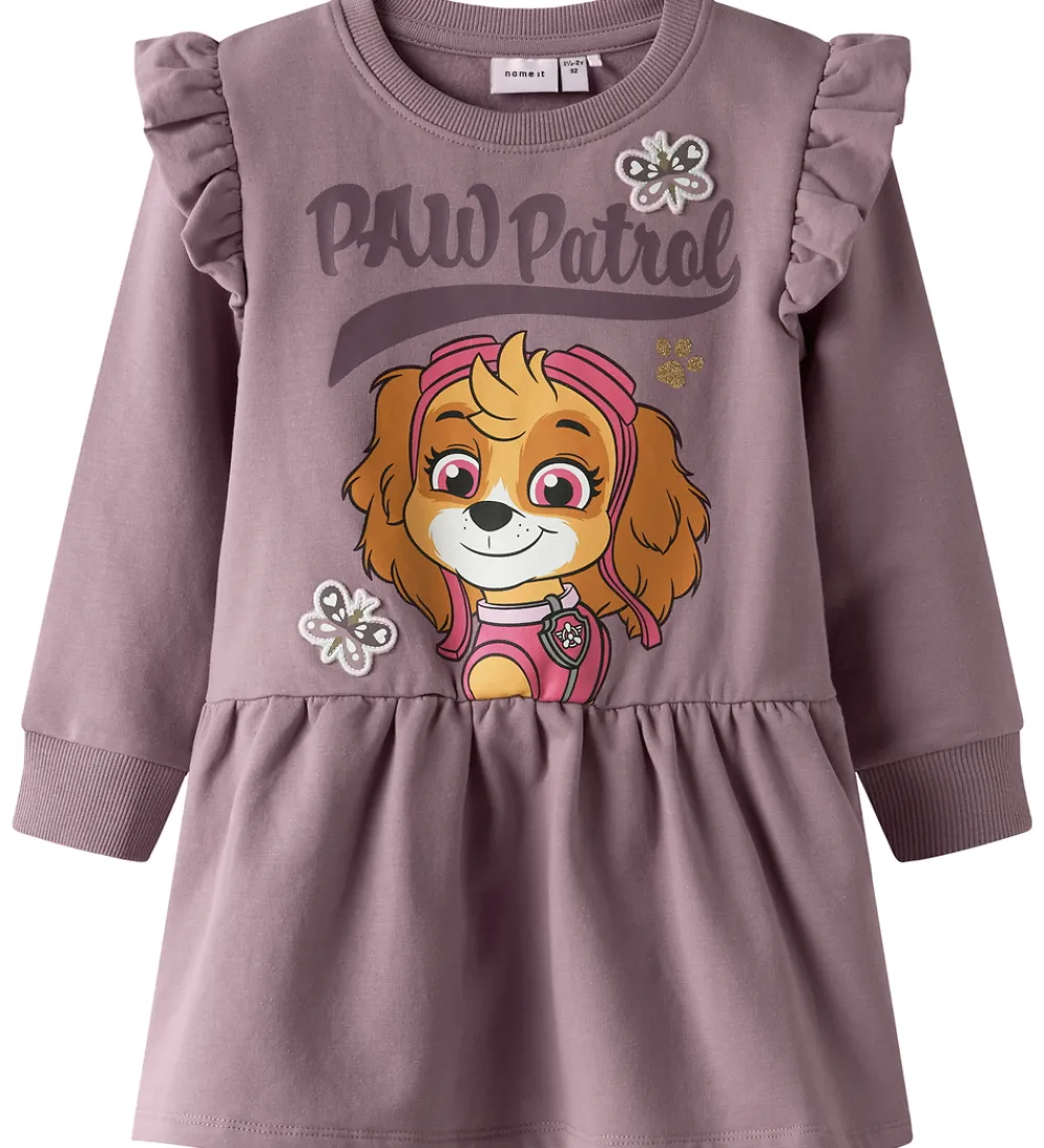 Charmerende Name It kjole i en støvet lilla nuance. Kjolen har lange ærmer med flæsedetaljer ved skuldrene. Fronten prydes af et sødt Paw Patrol print med sommerfugle og glimmerdetaljer. Name It kjolen har en behagelig rund halsudskæring og en let rynket talje.