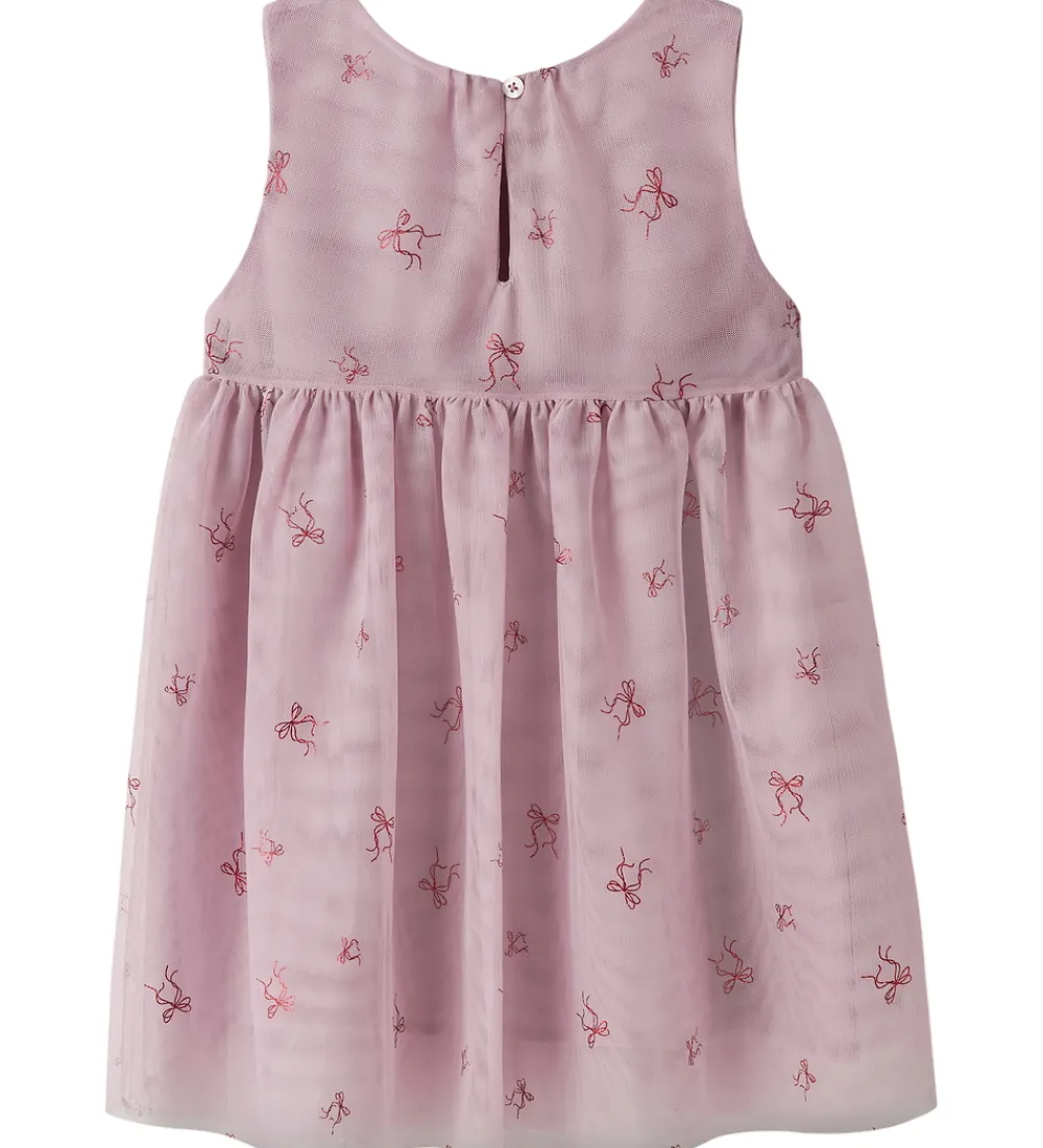 Fin Name It kjole i rosa med print af små sløjfer i rød glimmer. Name It kjolen er ærmeløs, og har en rund halsudskæring med en knap i nakken. Kjolen består af et lag genanvendt polyester inderst og to lag tyl yderst.