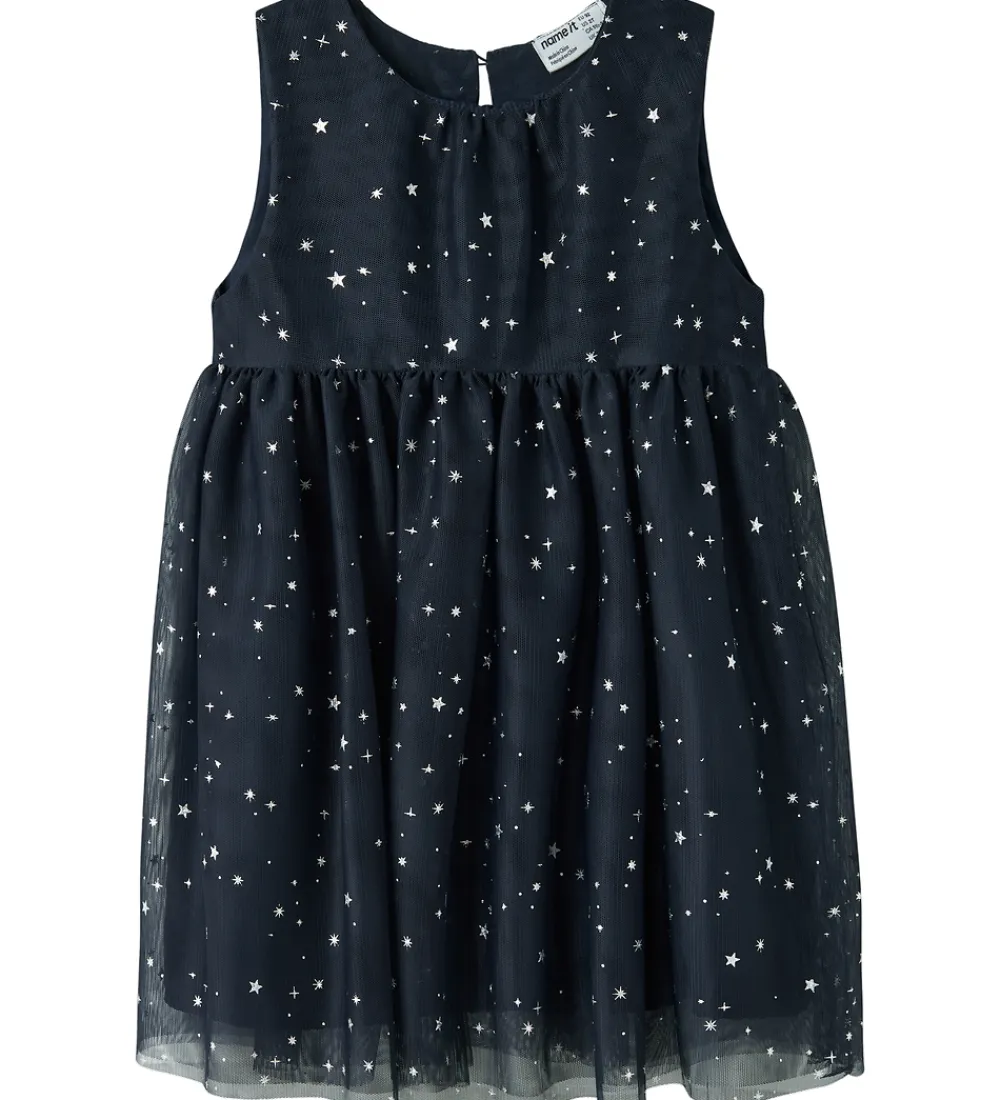 Elegant Name It kjole i navyblå med stjerner i sølv glimmer. Name It kjolen er ærmeløs, og har en rund halsudskæring med en knap i nakken. Kjolen består af et lag genanvendt polyester inderst og to lag tyl yderst.