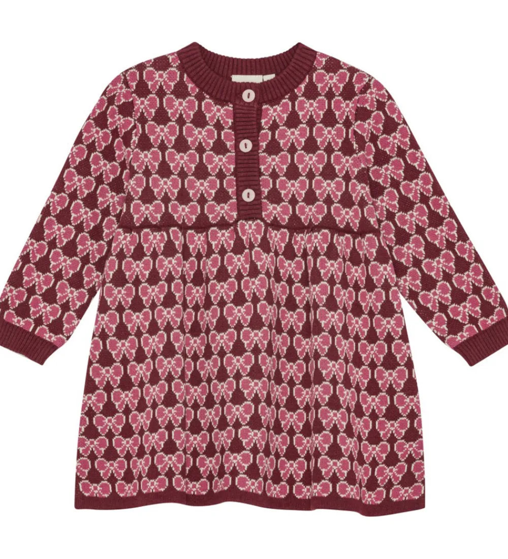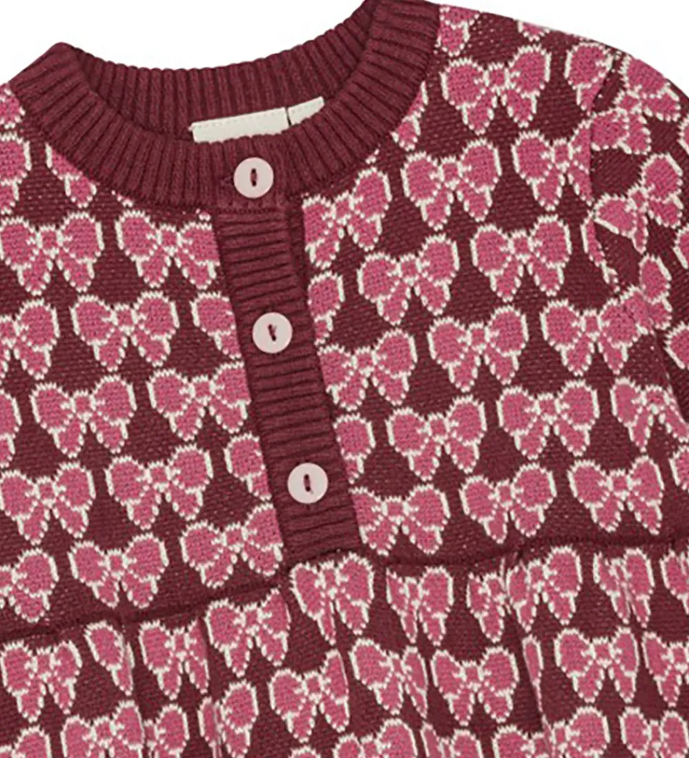 Elegant Flöss kjole med et unikt sløjfemønster i bordeauxrøde og lyserøde nuancer. Flöss kjolen har lange ærmer og knappelukning foran. Strukturen er detaljeret med ribkant ved hals og håndled.