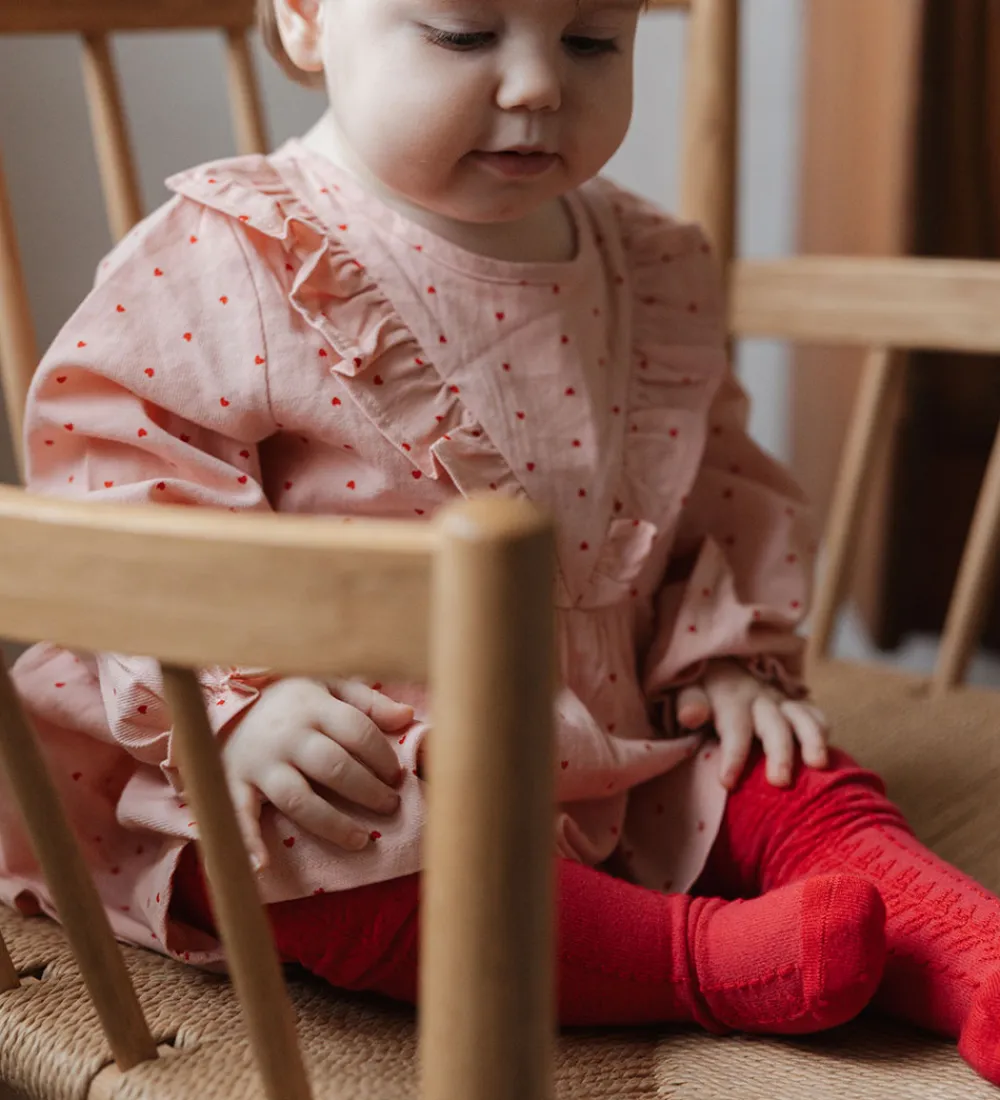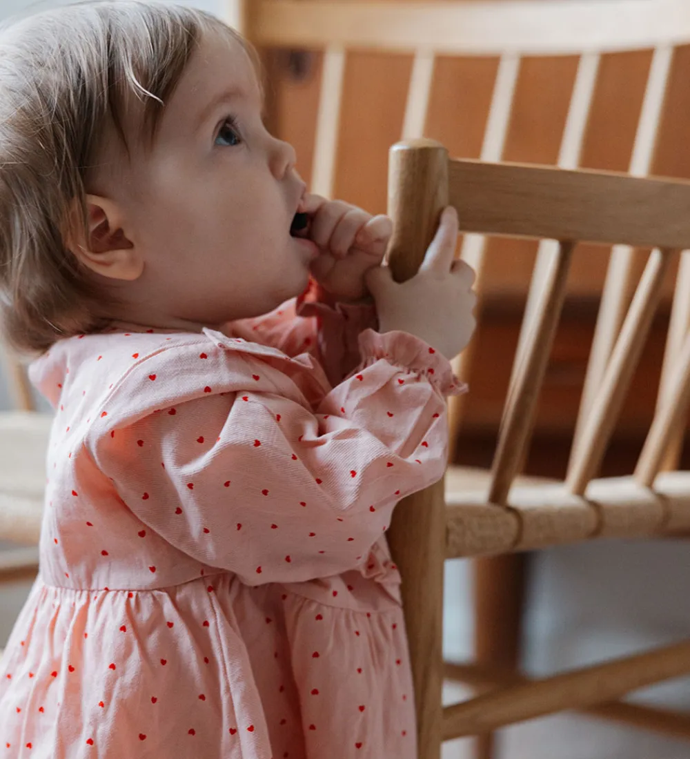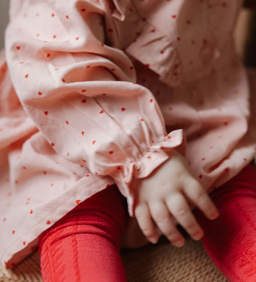 Elegant Petit Piao kjole i en fastvævet kvalitet med et fint print af små hjerter i rødt på en sart lyserød baggrund. Kjolen har lange ærmer og flæsedetaljer ved skuldrene. Petit Piao kjolen er designet med en blød, rund halsudskæring, der har en dråbeformet åbning i nakken, og skøret har en god vidde og er med et inderskørt.