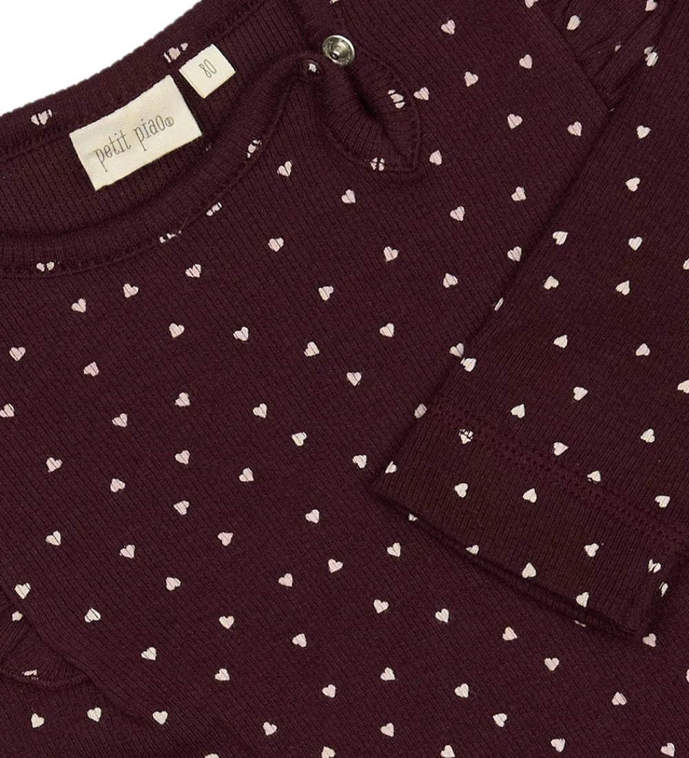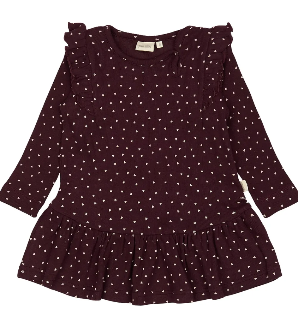 Elegant Petit Piao kjole i en dyb bordeauxrød nuance med små rosa hjerter. Kjolen har lange ærmer og flæsedetaljer på skuldrene. Petit Piaos design inkluderer en skørt nederdel, der giver et flot fald.