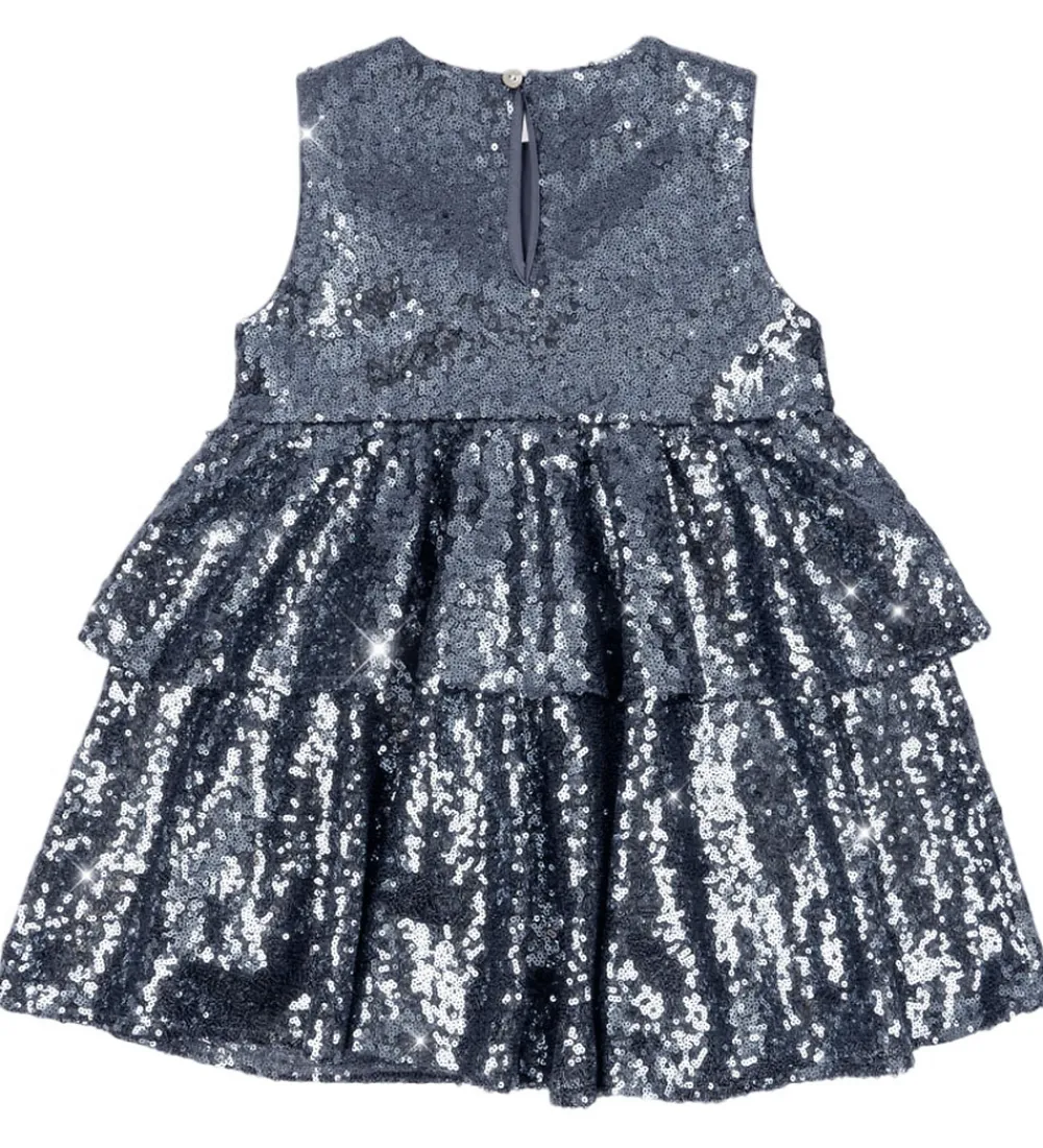 Elegant Konges Sløjd kjole med blå pailletter med et metallisk skær. Kjolen er helt uden ærmer, og fortil sidder der en stor sløjfe. Nedenunder falder skørtet med masser af vidde og i forskuldte lag. Kjolen lukkes i nakken med en knap. Kjolen har et ekstra lag af bomuld på indersiden.