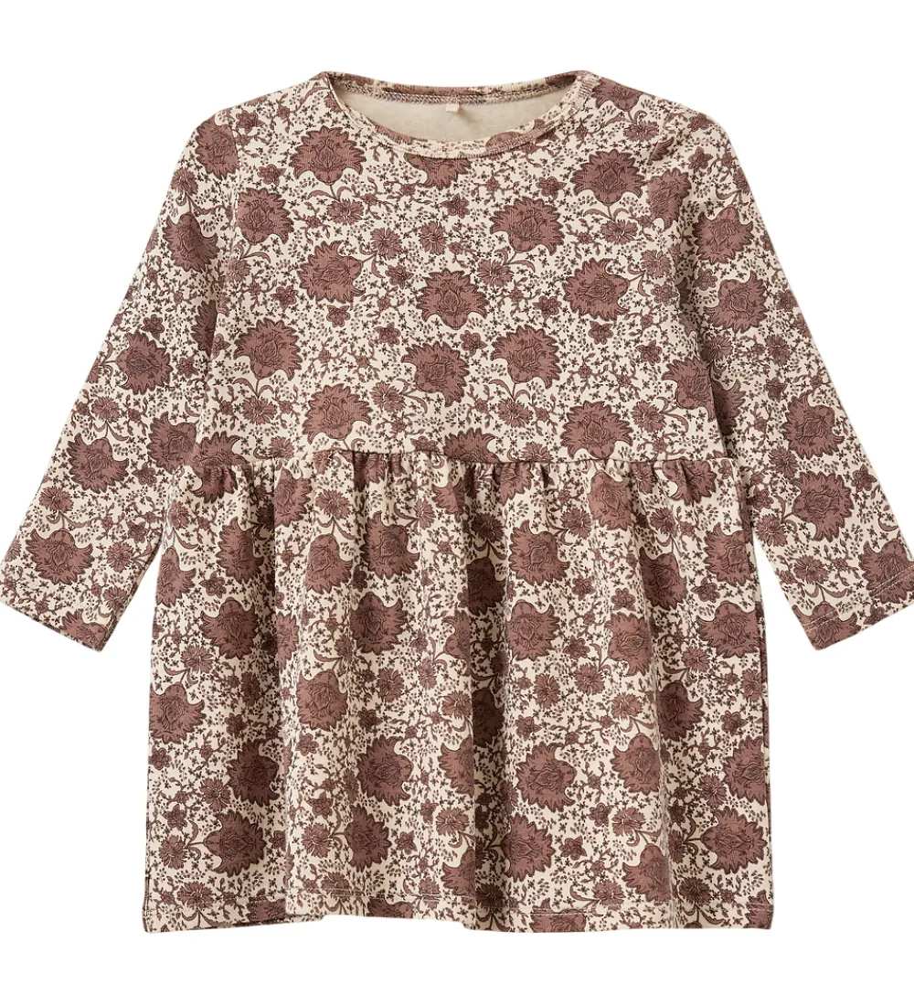 Elegant Sofie Schnoor kjole i beige med et mønster af støvet, mørkerosa blomster. Kjolen fra Sofie Schnoor har lange ærmer og en afrundet halsudskæring, der fuldender looket.