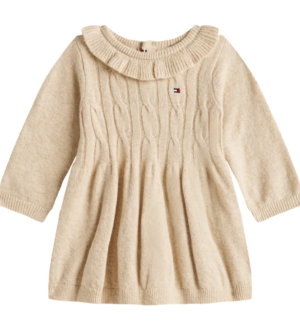 Elegant Tommy Hilfiger kjole i en blød beige nuance i en strikket kvalitet med et snoet mønster fortil. I halsåbningen er der en fin krave hele vejen rundt, og den har smalle ribkanter. Kjolen lukkes i nakken med en enkelt knap.